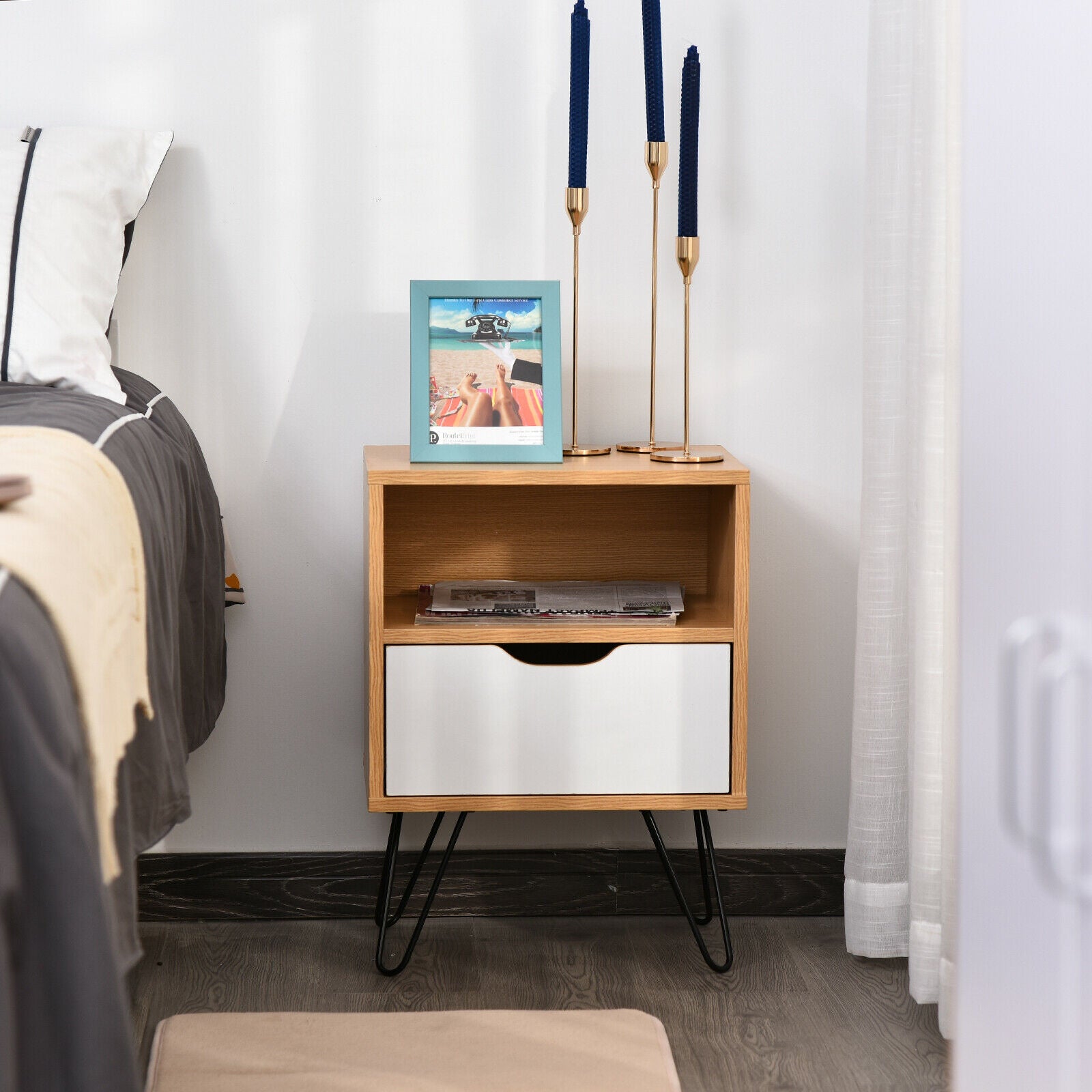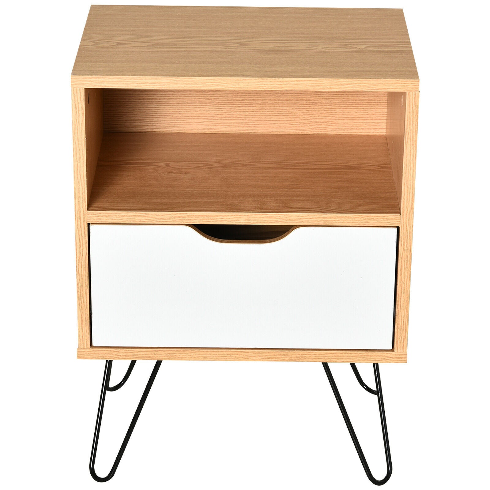 Modern Bedside Table Cabinet w/ Compartment Drawer Nightstand Metal Legs