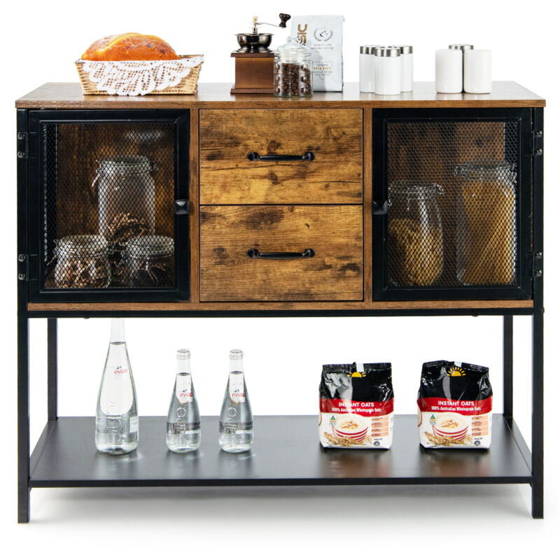 Industrial Buffet Sideboard Accent Console Table w/ 2 Mesh Cabinets 2 Drawers