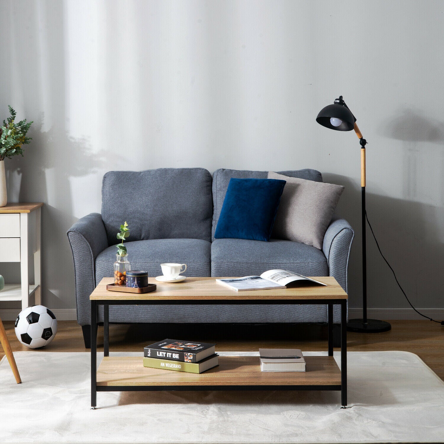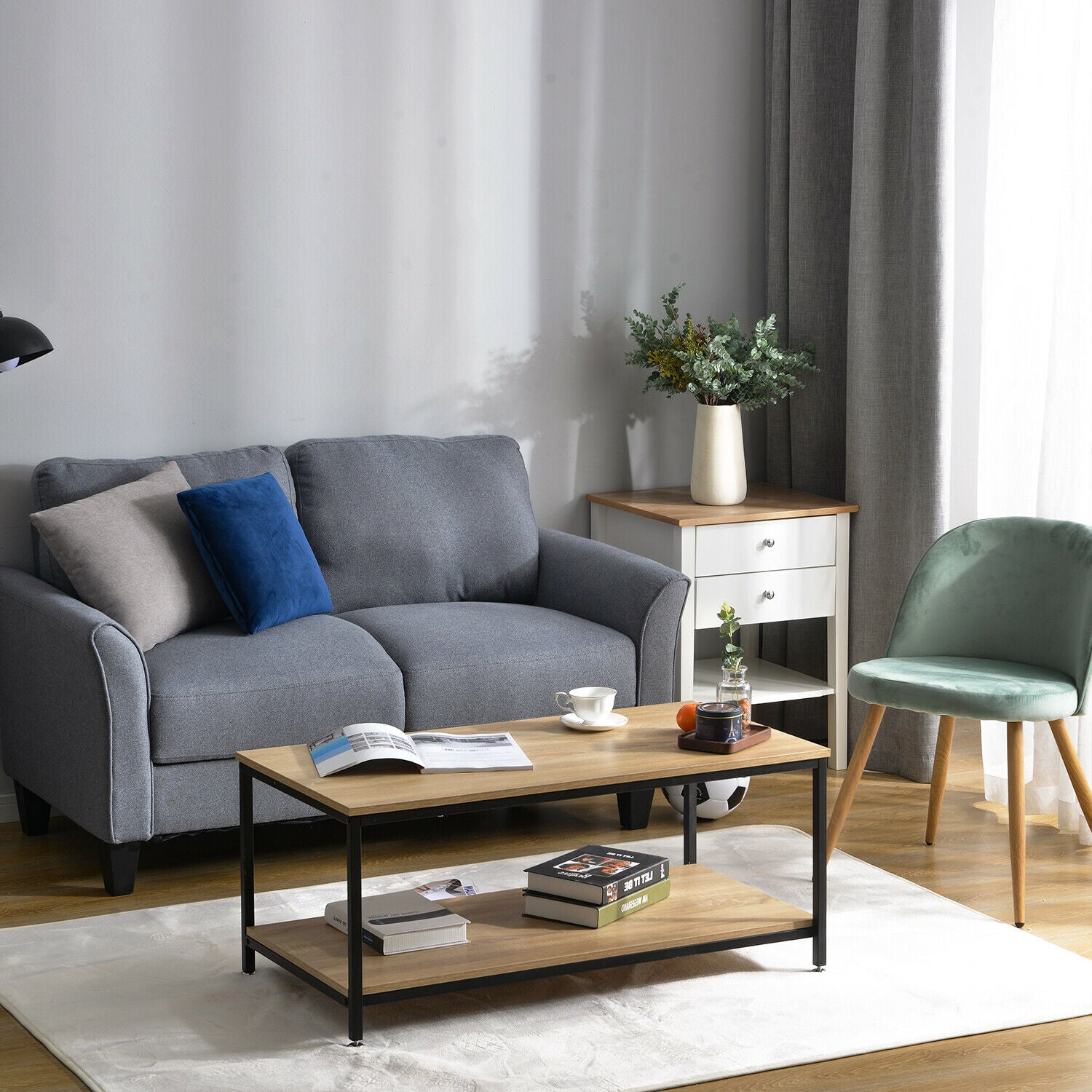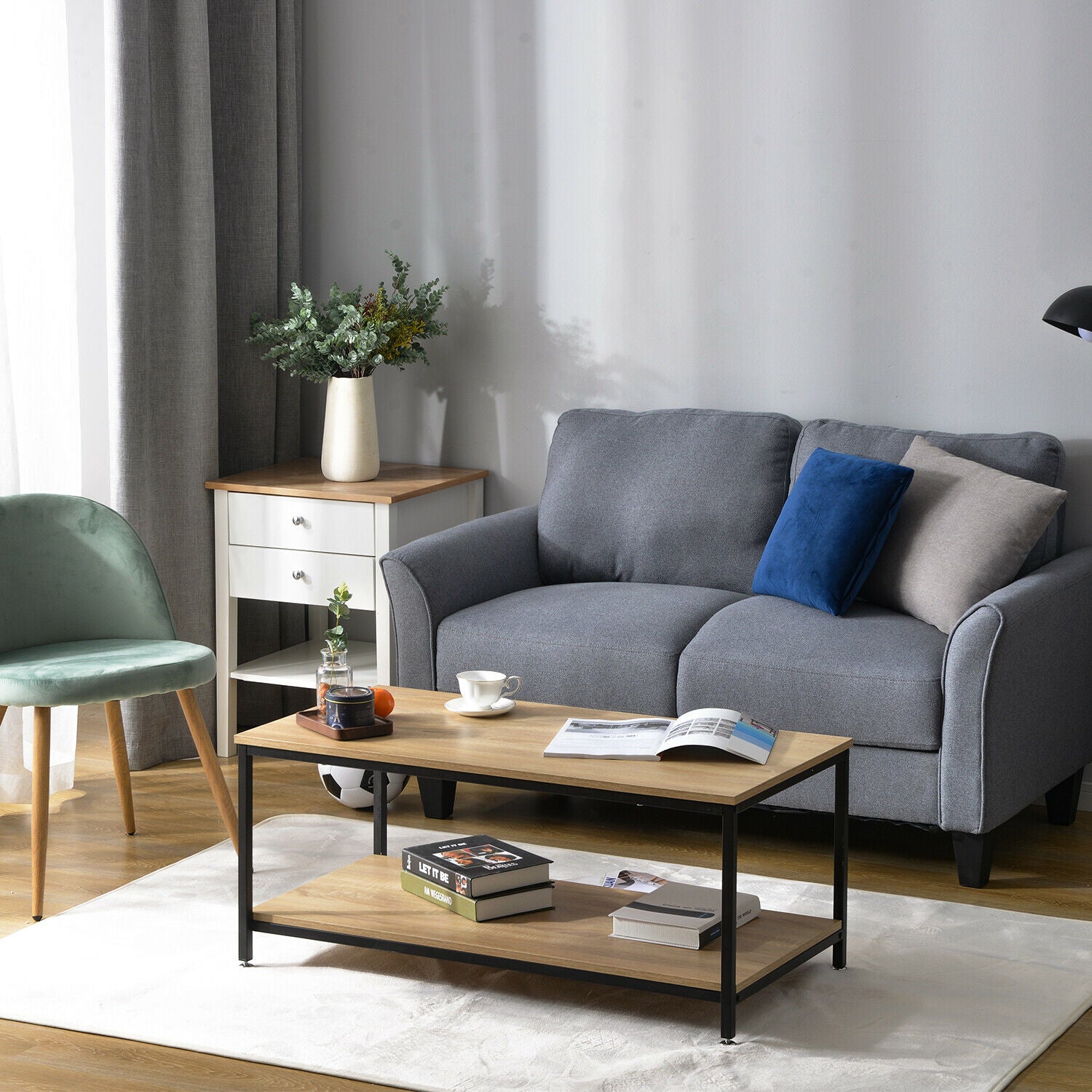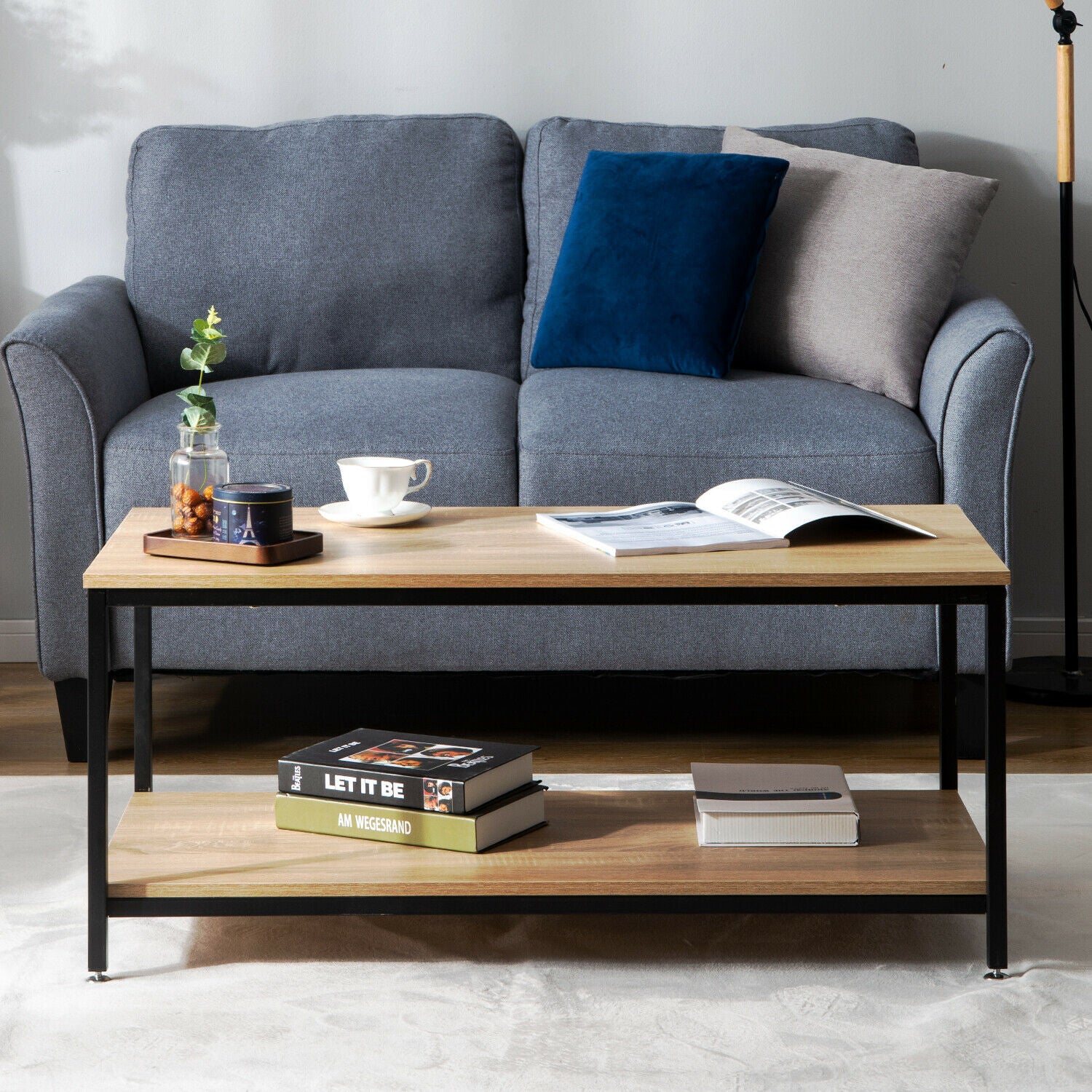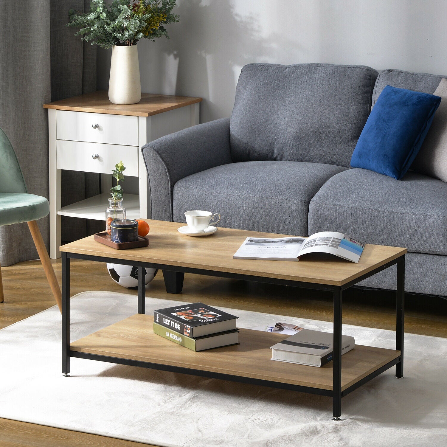 Industrial Coffee Table for Living Room with Storage Shelf Wood Look Metal Frame