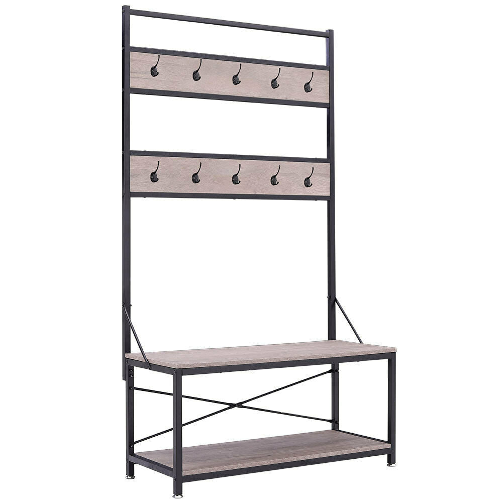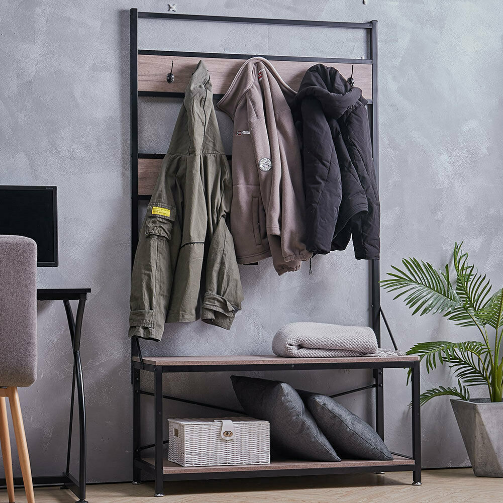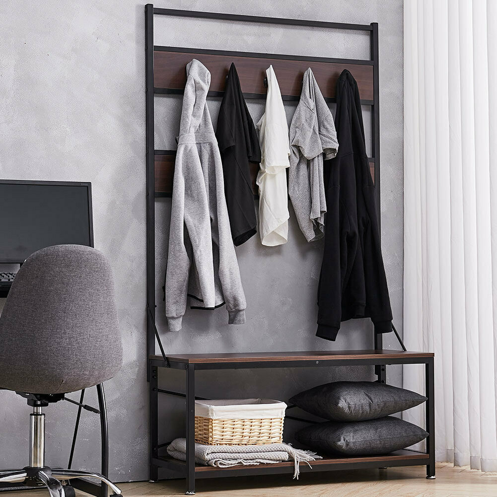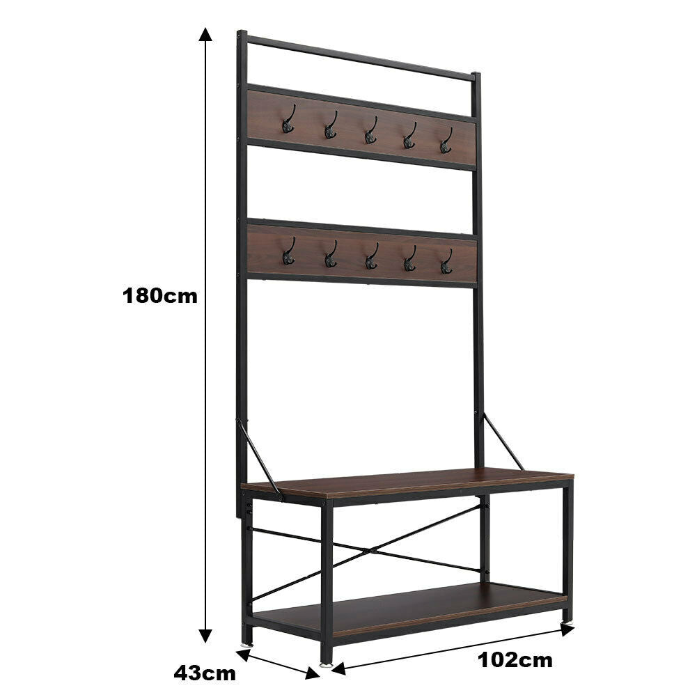 Industrial Hat Coat Stand Clothes Hanging Rack With 2 Tier Shoe Storage Bench