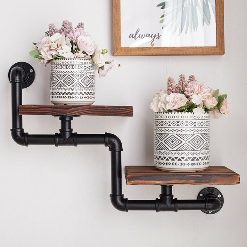 Industrial Pipe Shelf 2-Tier Wall Floating Shelf Wooden Storage Display Shelving