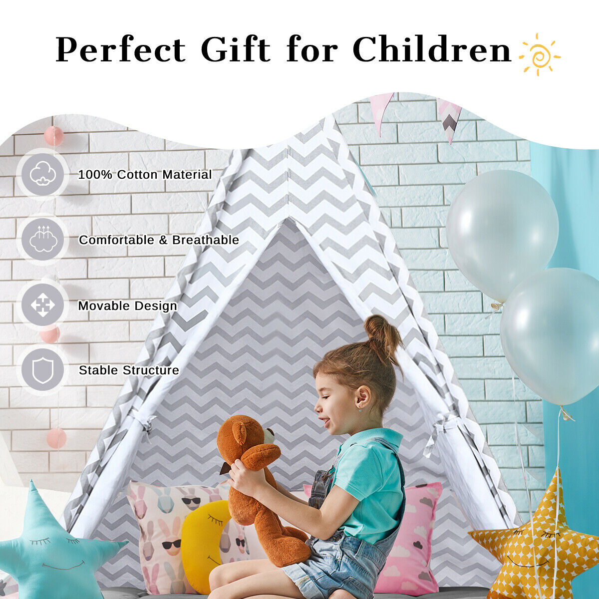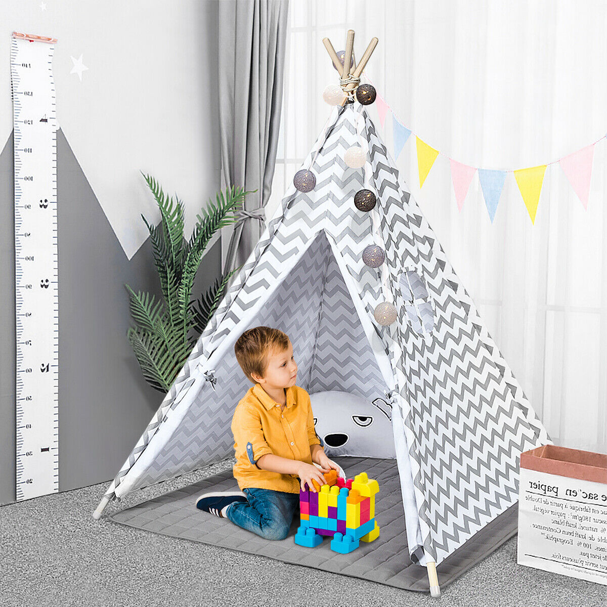 Kids Teepee Tent With Floor Mat Cotton Canvas Indian Indoor Outdoor Play House