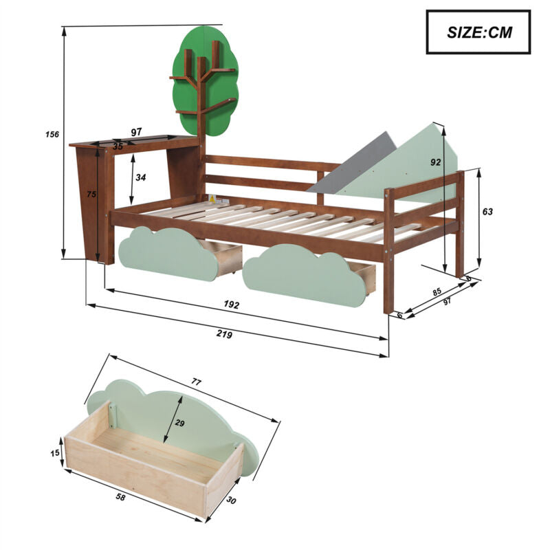 Kids Toddler Bed 3ft Single Junior Bed with 2 Storage Drawers Desk Tree Shelves