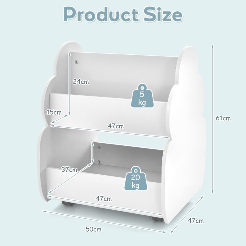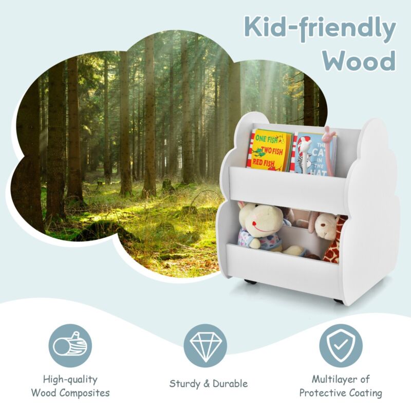 Kids Wooden Bookcase w/ Wheels 2-Tier Toy Storage Toddler Display Book Shelf