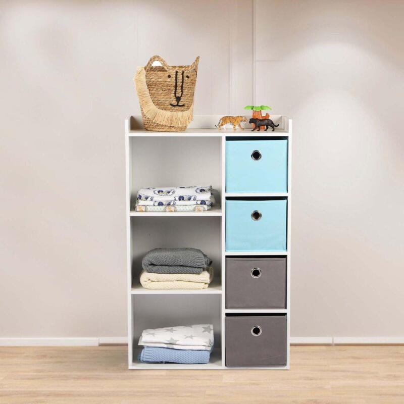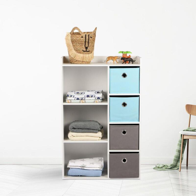 Kids Wooden Storage Cabinet 4 Shelves And 3 Basket Drawers Toys Storage Unit