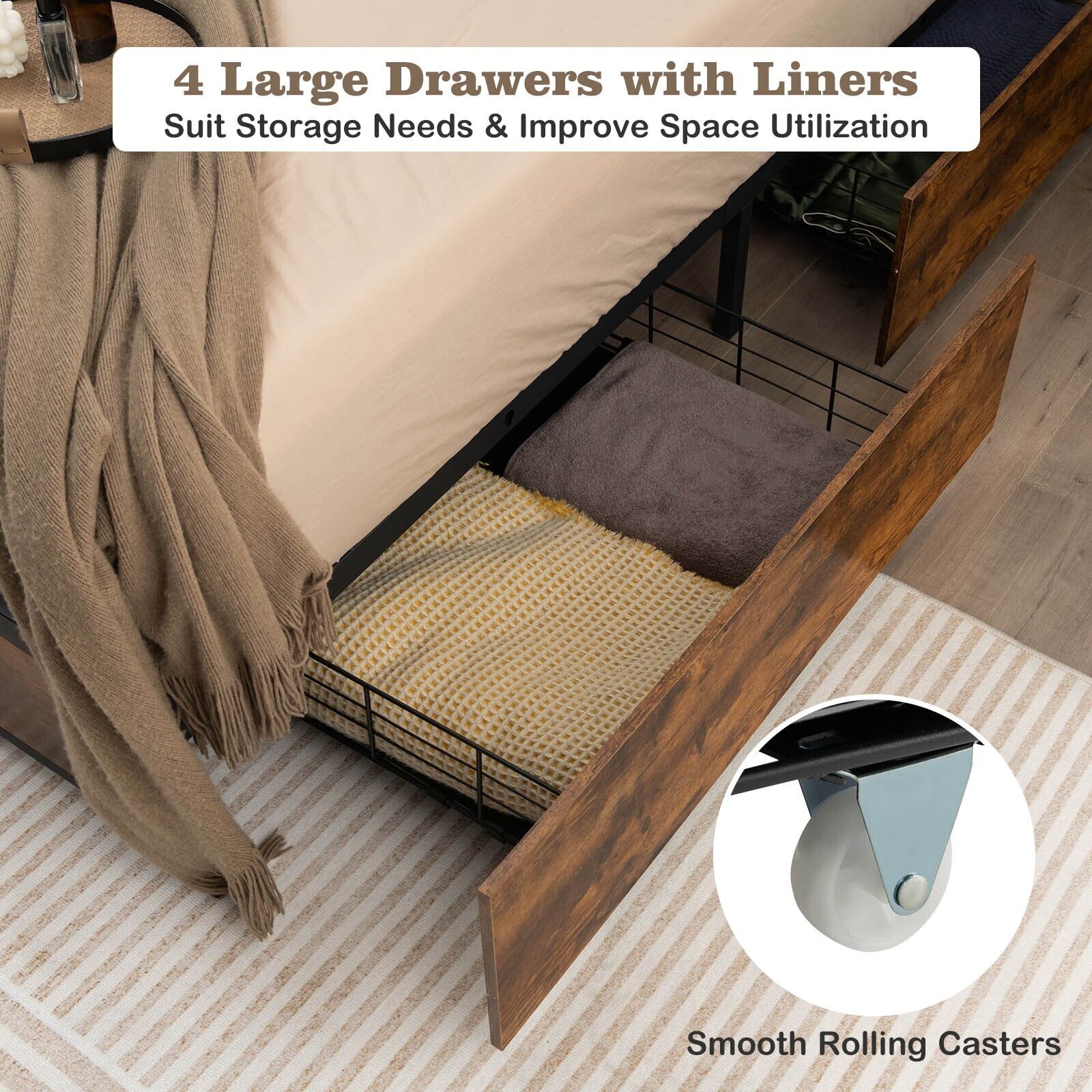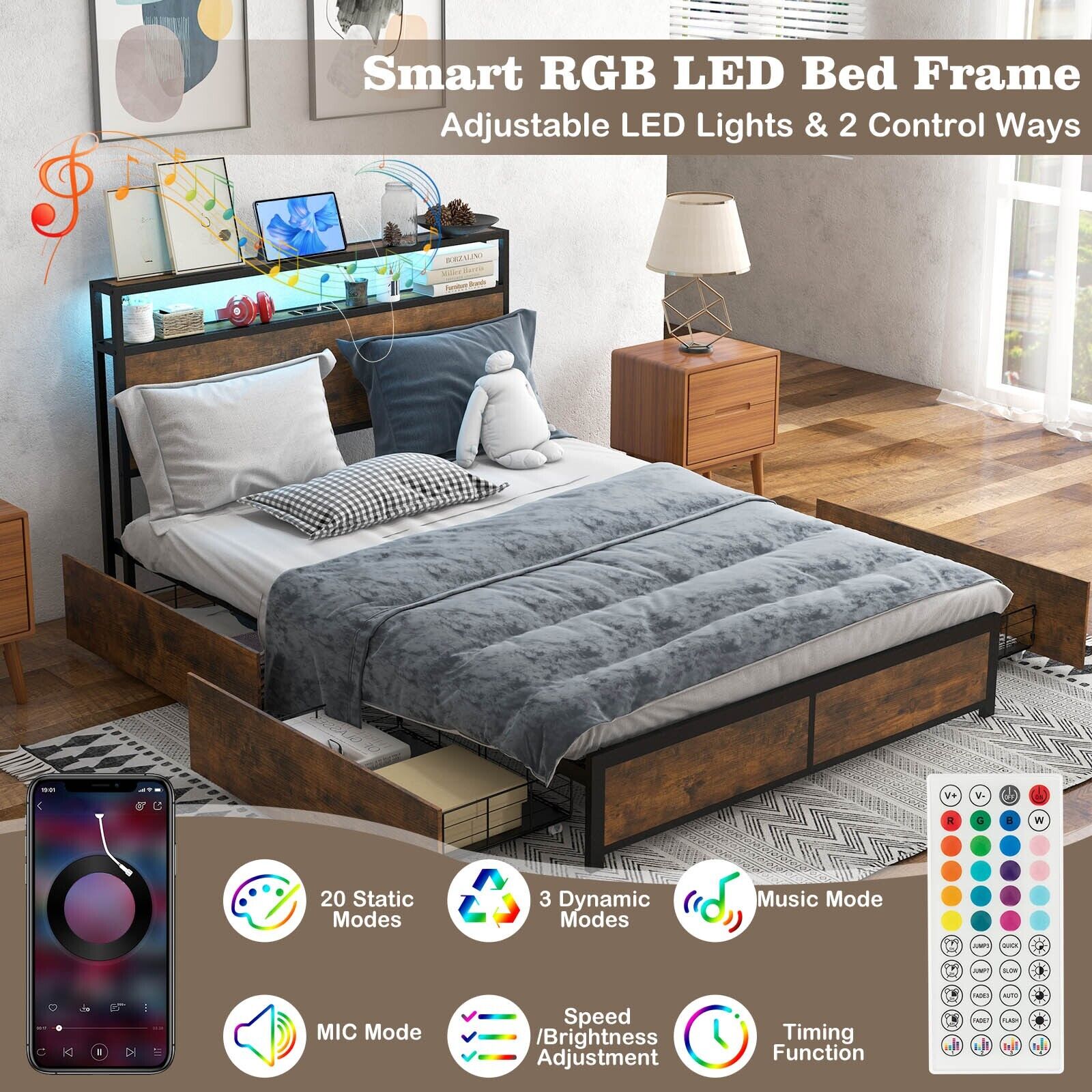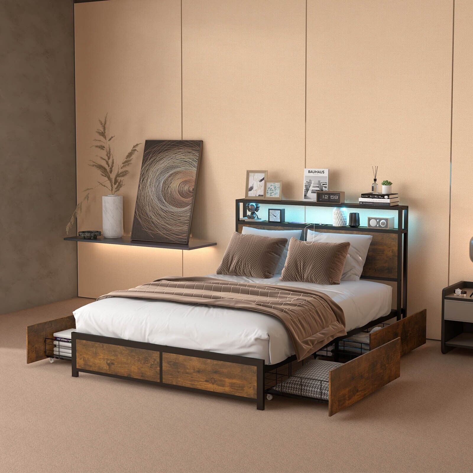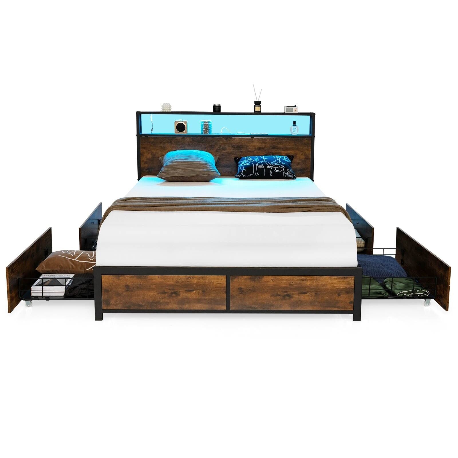 King Size Bed Frame Metal Bed Platform LED Lights Headboard & 4 Storage Drawers