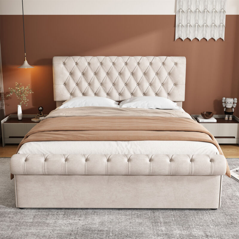 KING SIZE Ottoman Gas Lift Storage Bed Velvet Upholstered Bed Frame Beige QZ