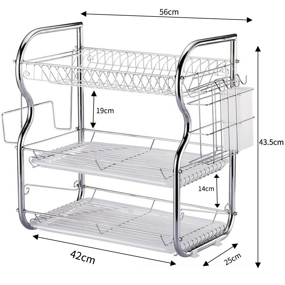 Kitchen Dish Drainer 3 Tier Chrome Alloy Plate Bowls Cutlery Rack With Drip Tray