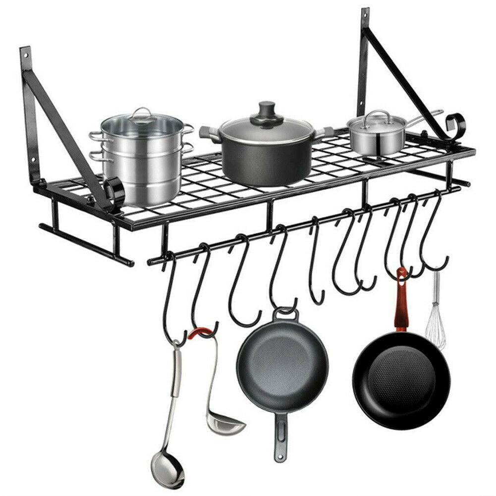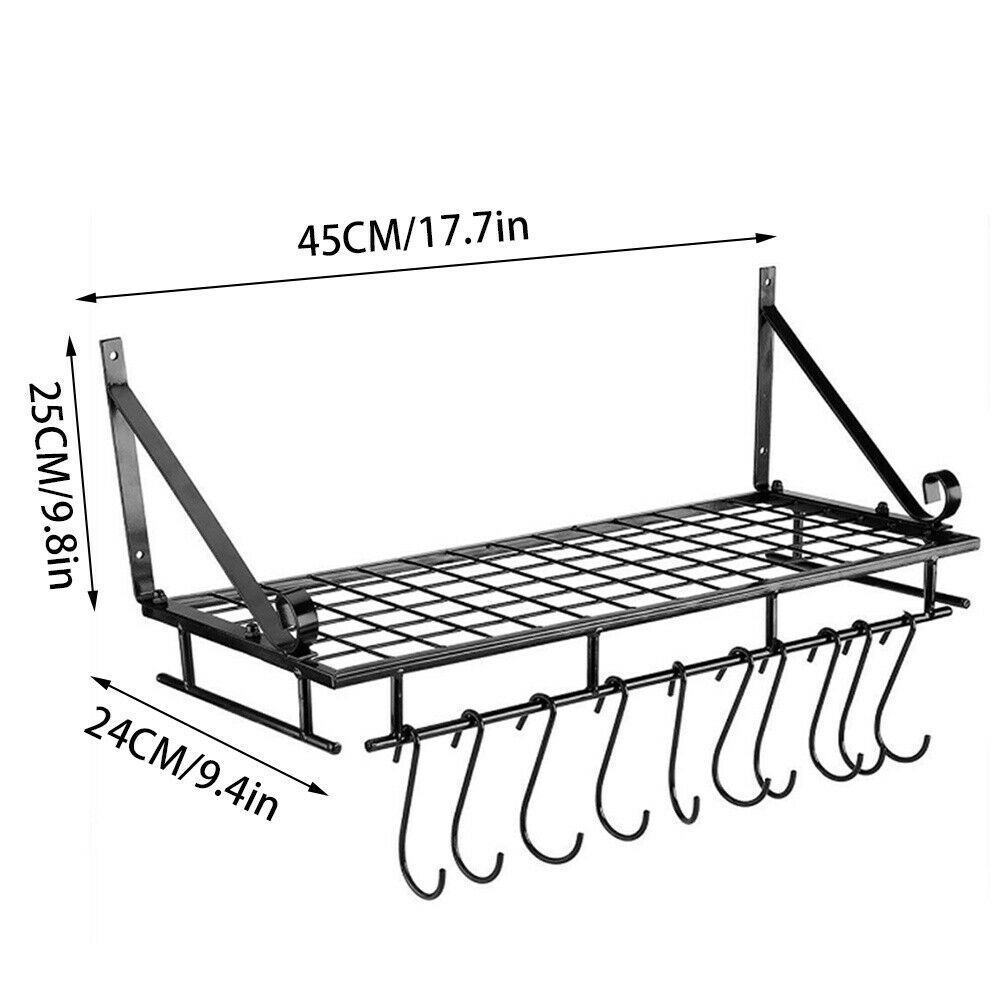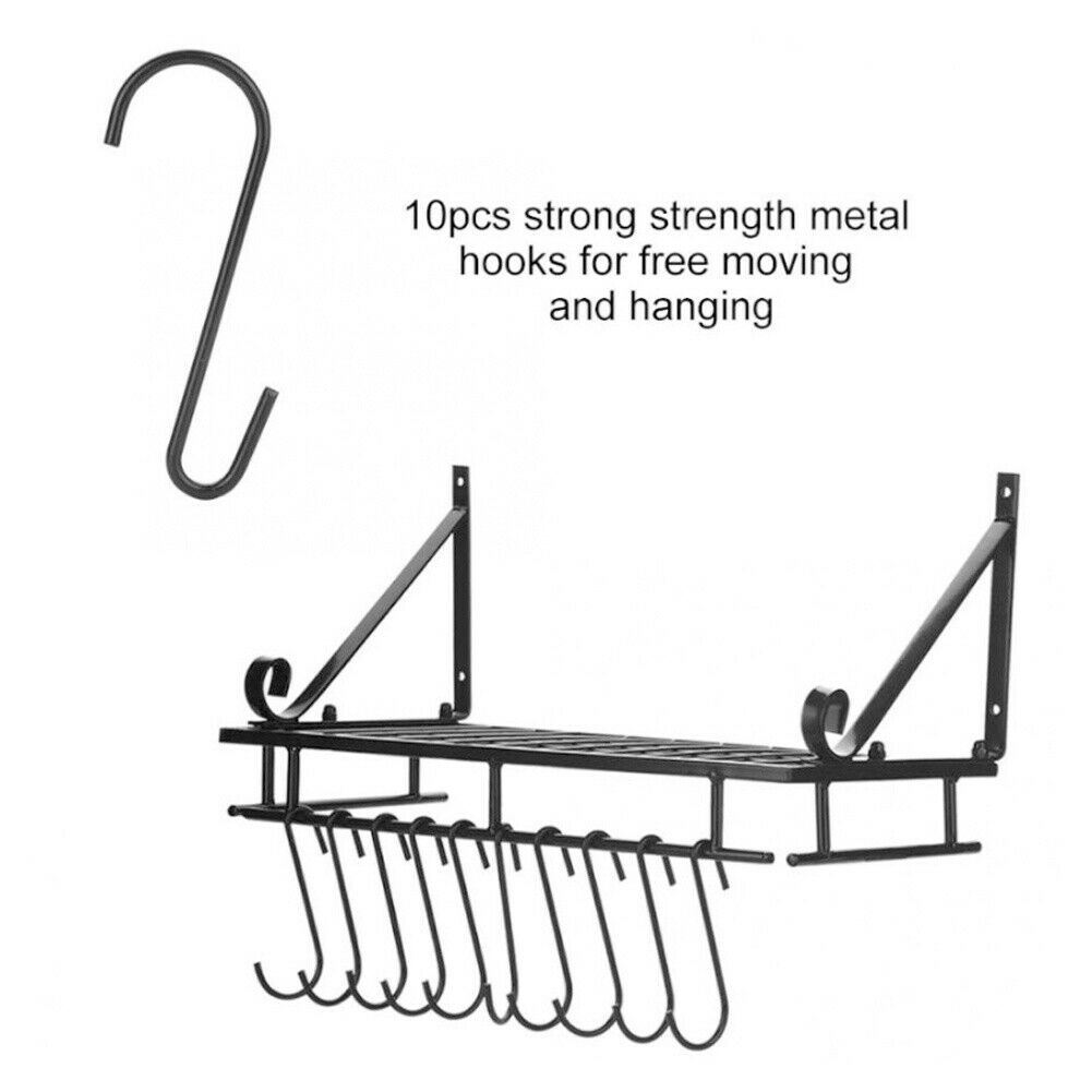 Kitchen Iron Shelf Utensil Hanging Pot Rack Saucepan Pan Organiser+10Hanger Hook