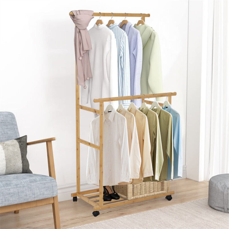 Large Bamboo Clothes Rail Wooden Garment Rack Trolley for Balcony Terrace Garden