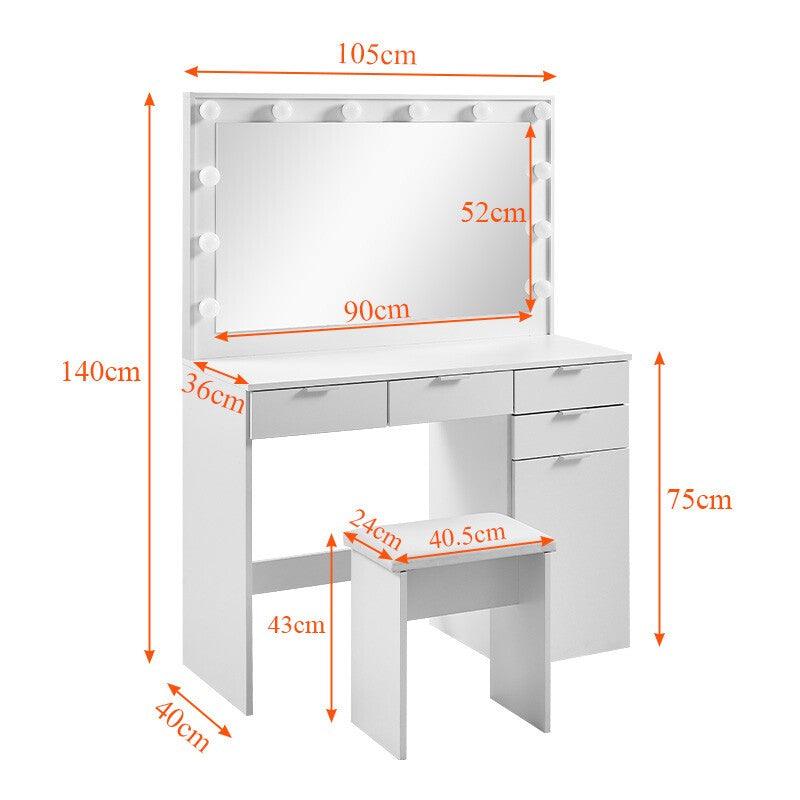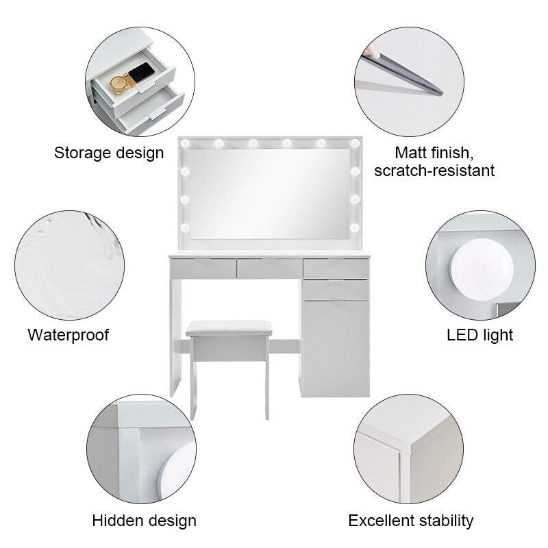 Large Dressing Table Stool Set with LED Light Mirror Vanity Make Up Desk Asdmhqn