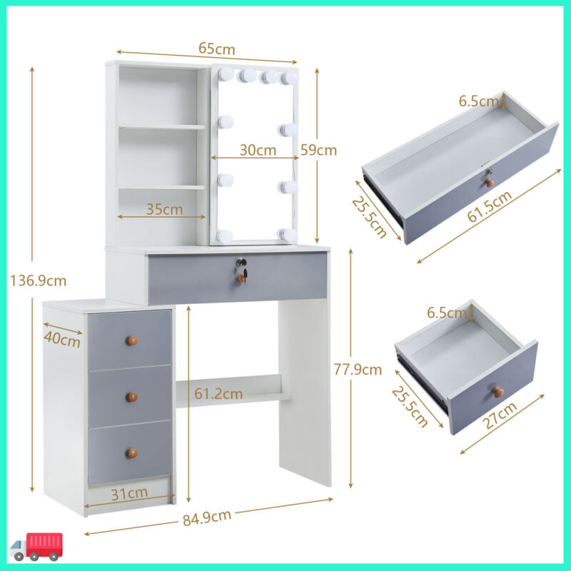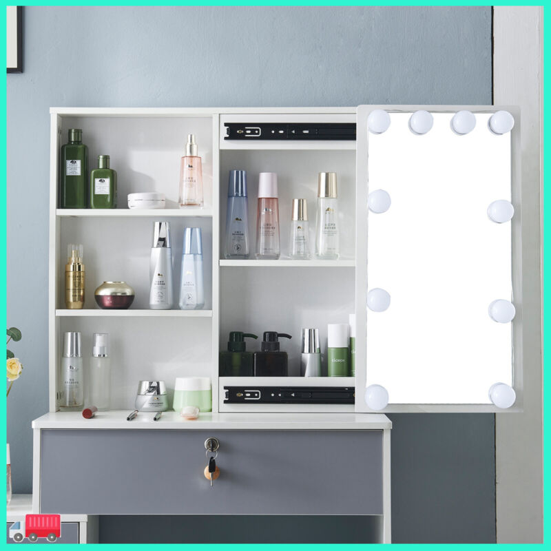 Features With Mirror, With Stool, Flat Pack, desk Included, With 10 Led Lights