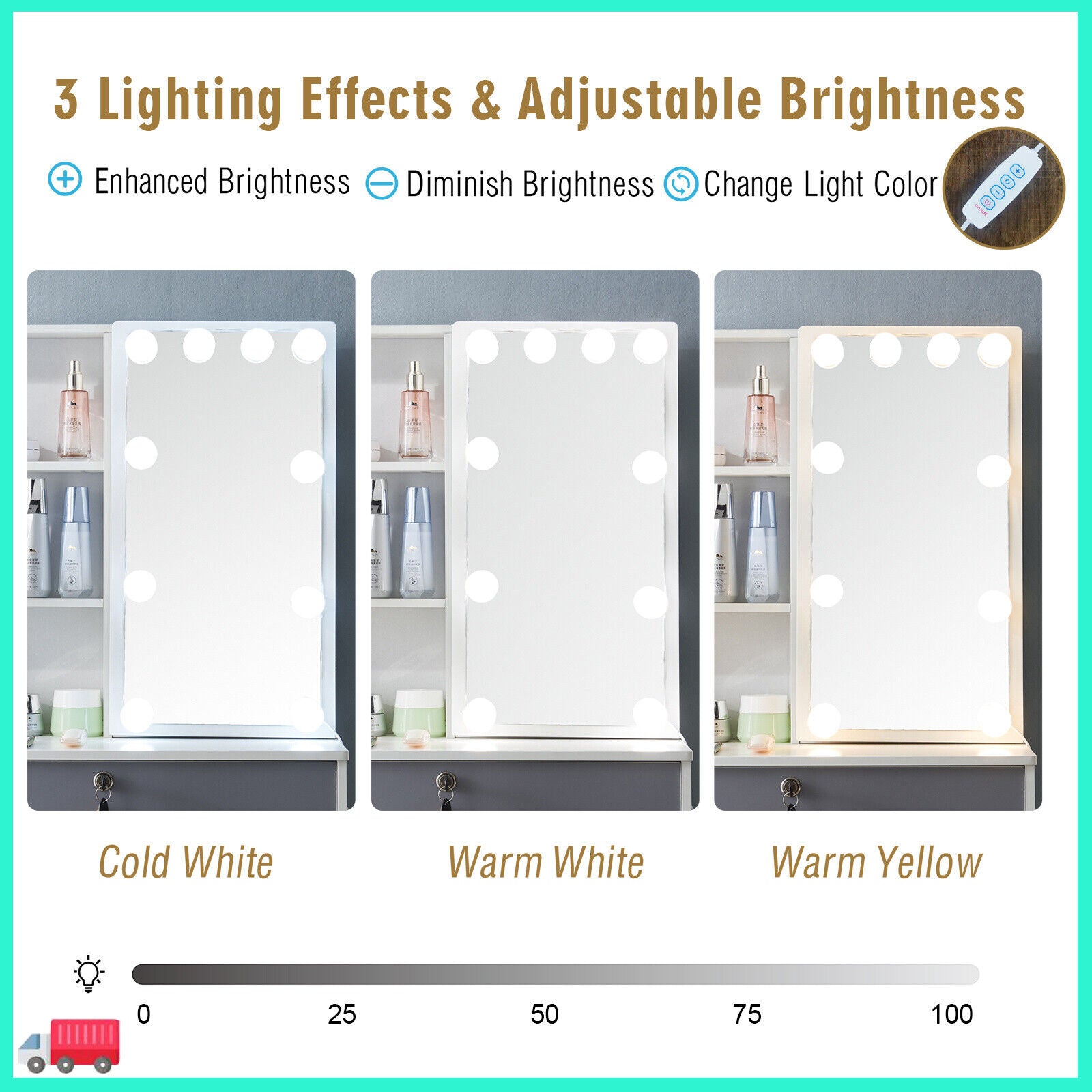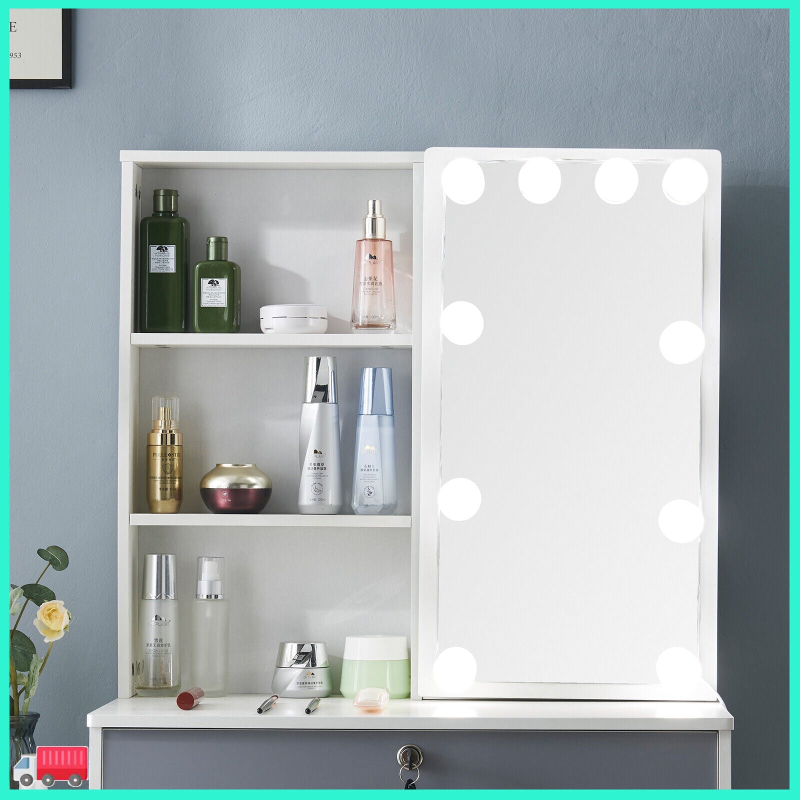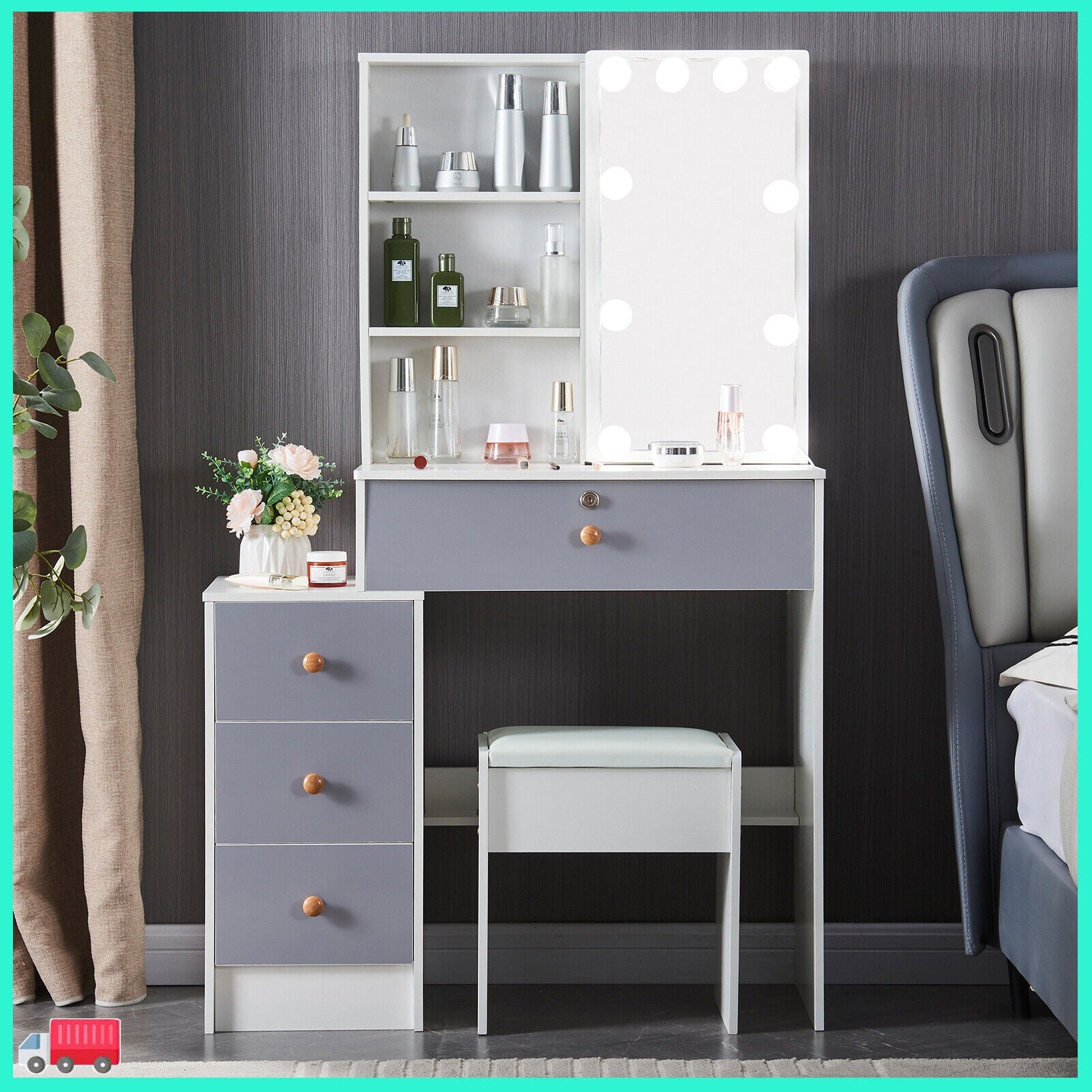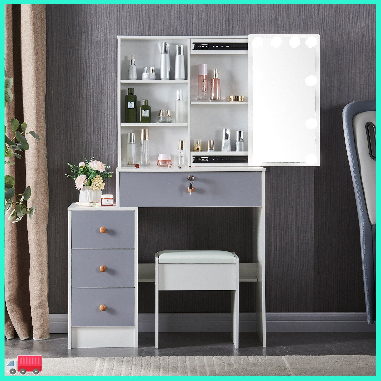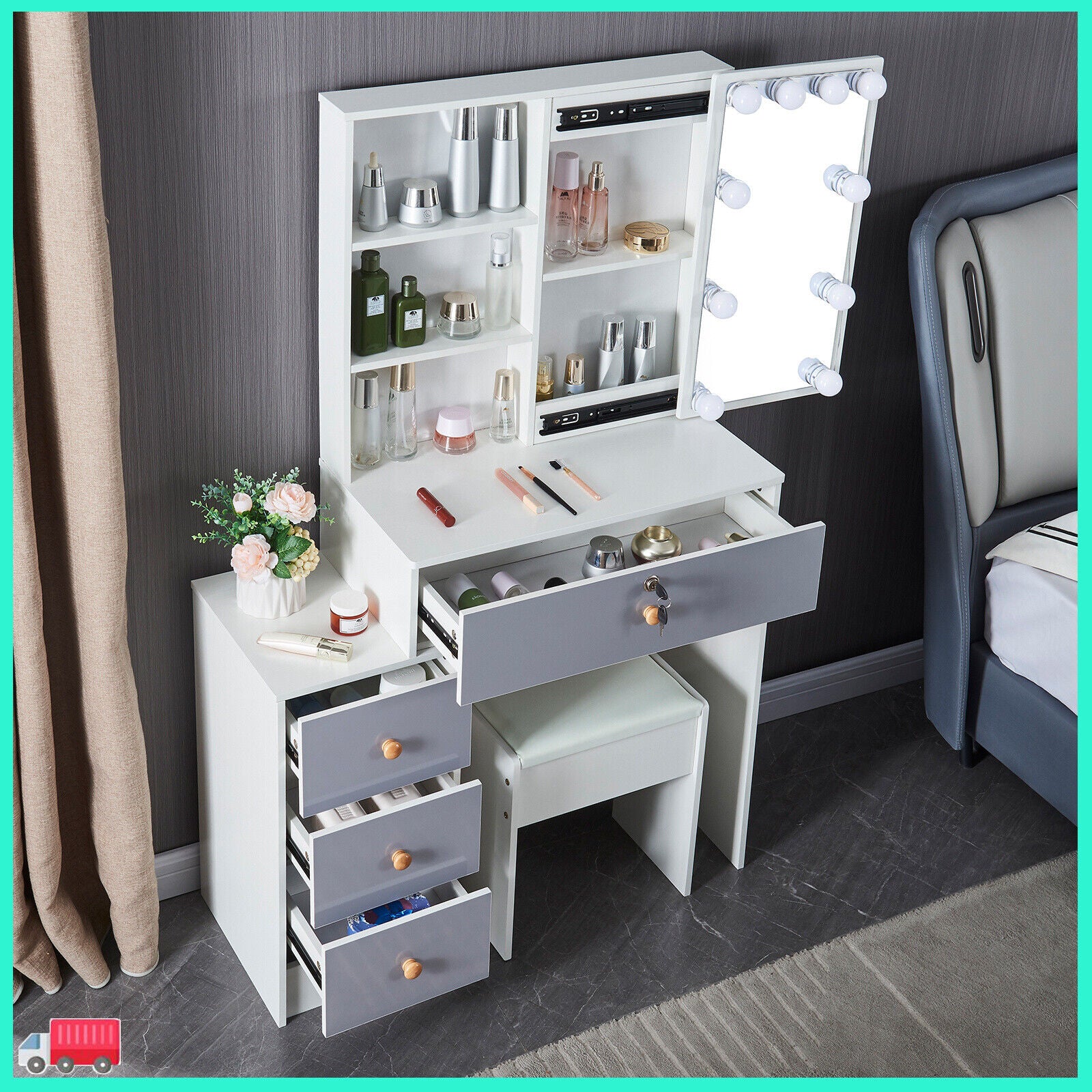 With Mirror, With Stool, Flat Pack, desk Included, With 10 Led Lights