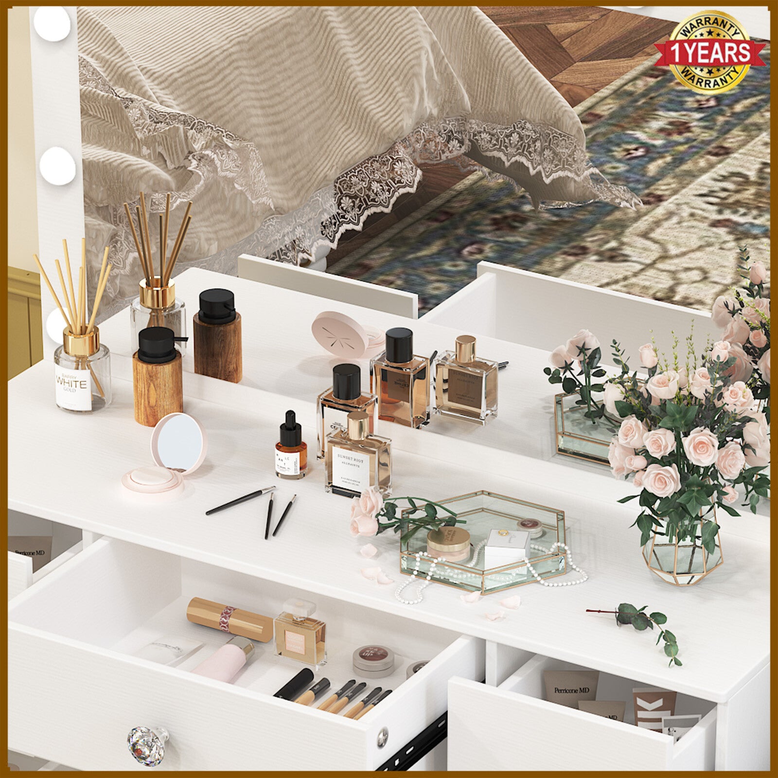 With Drawers, Without Stool, With Mirror, With Cupboard, Flat Pack, Hidden Storage, Open Shelves, with 11 led lights, Large Mirror