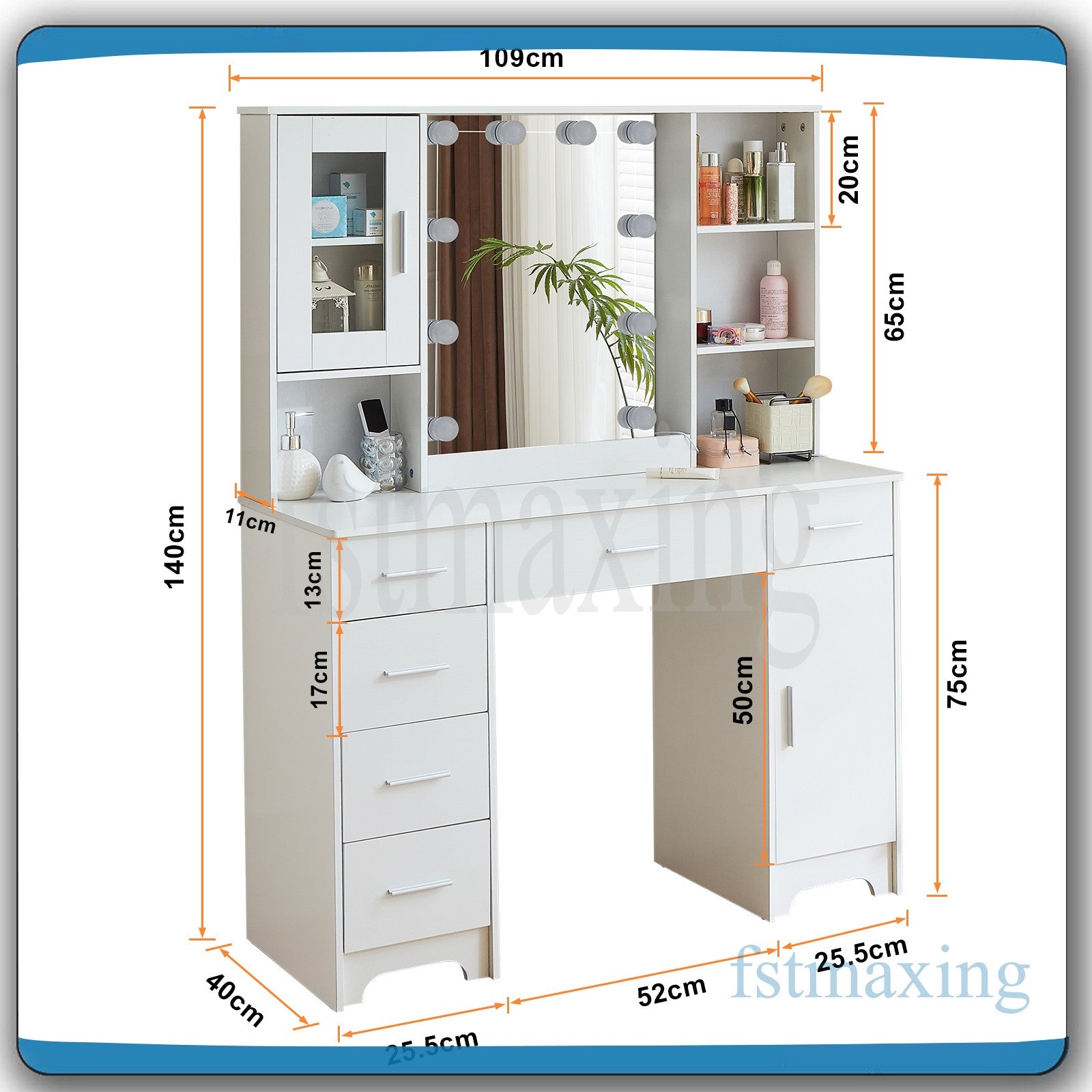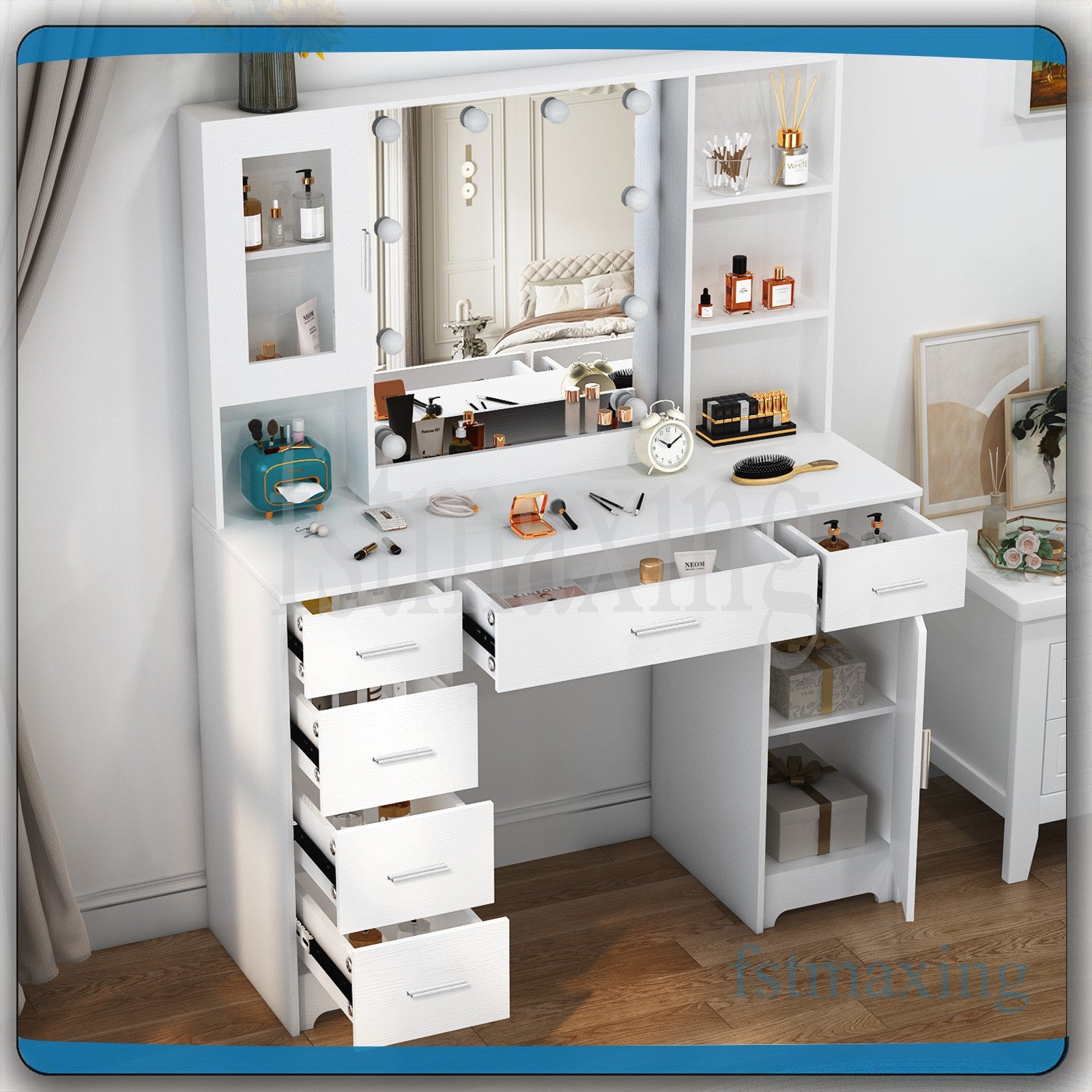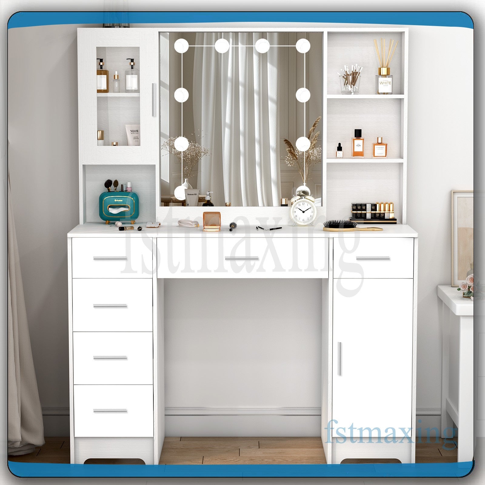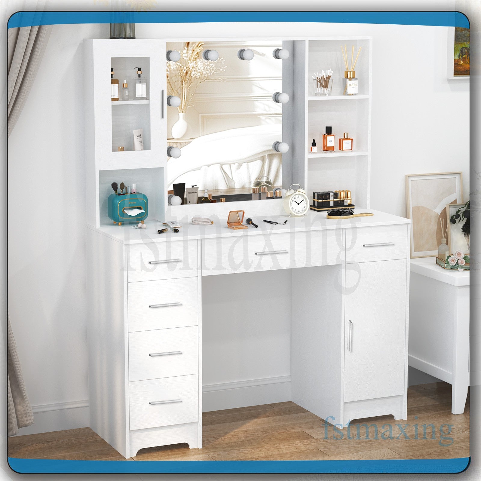 Large Dressing Table With Mirror LED Lights 7 Drawers Cabinet Vanity Makeup Desk