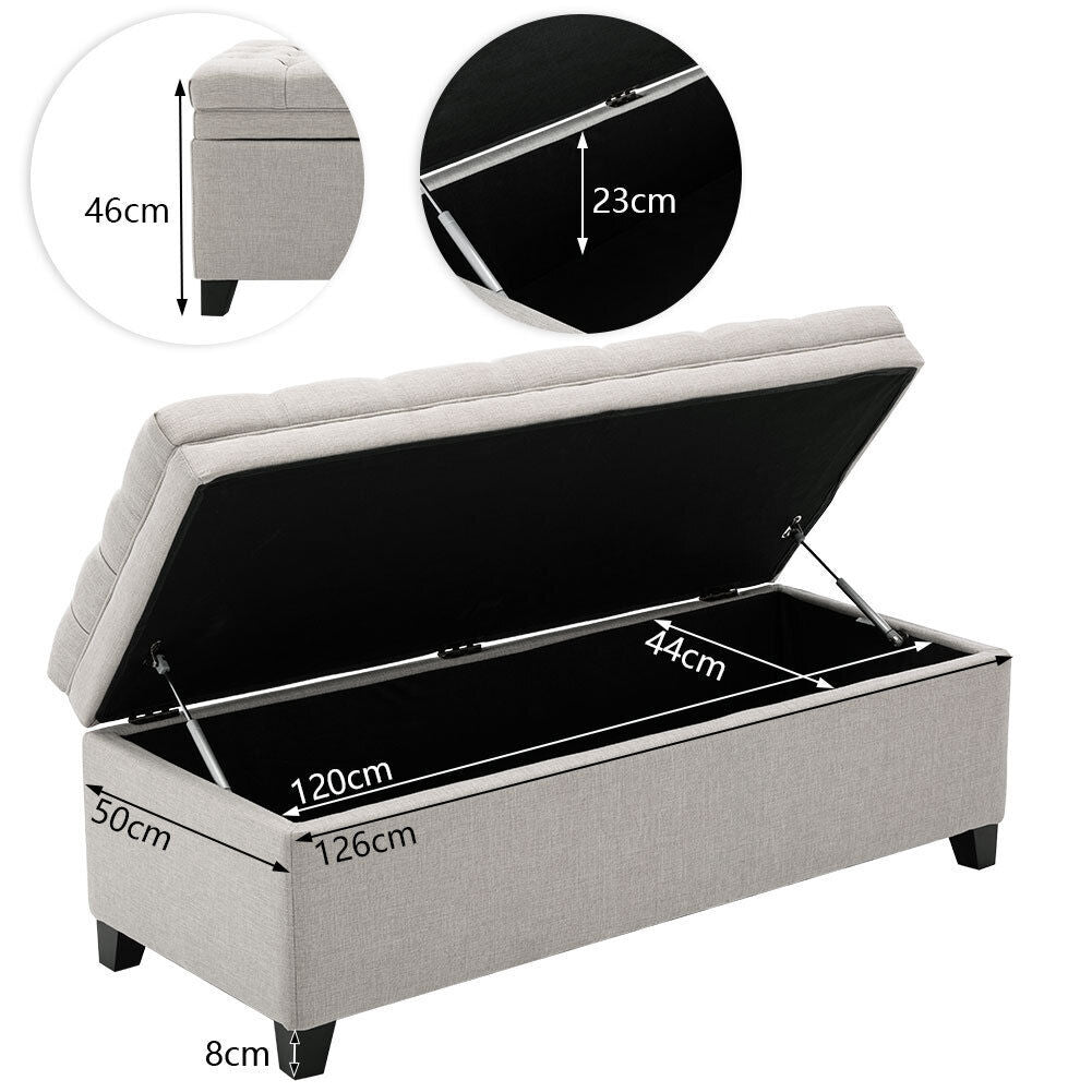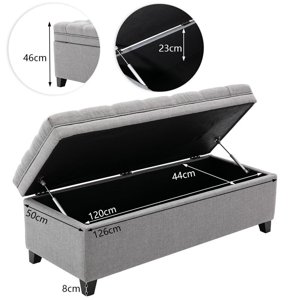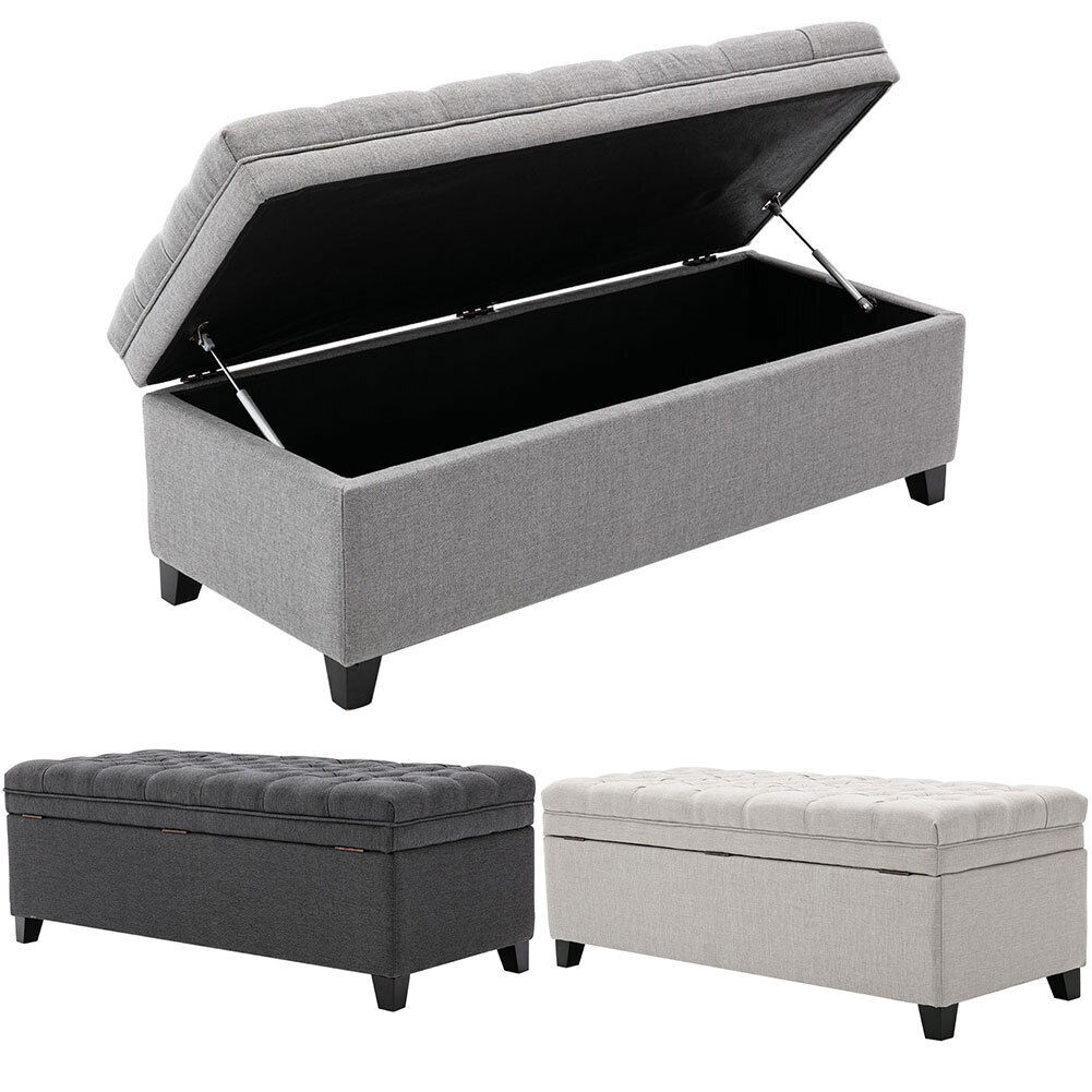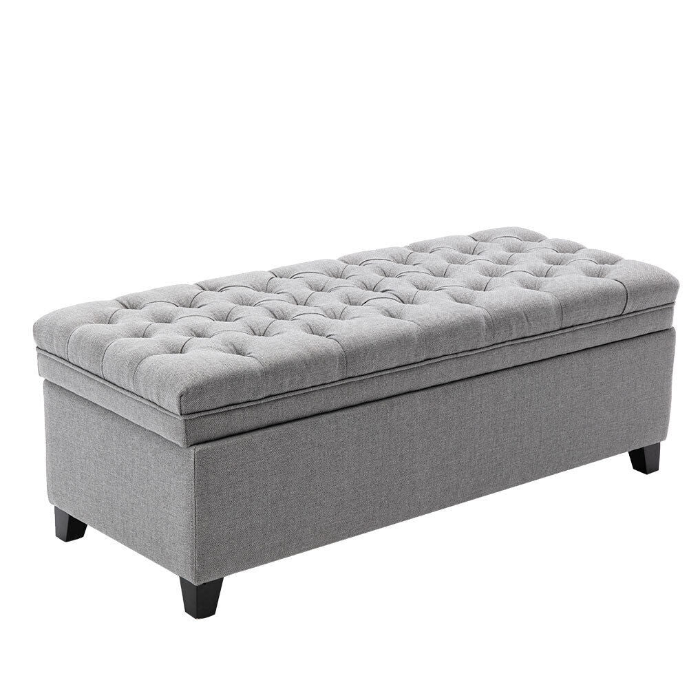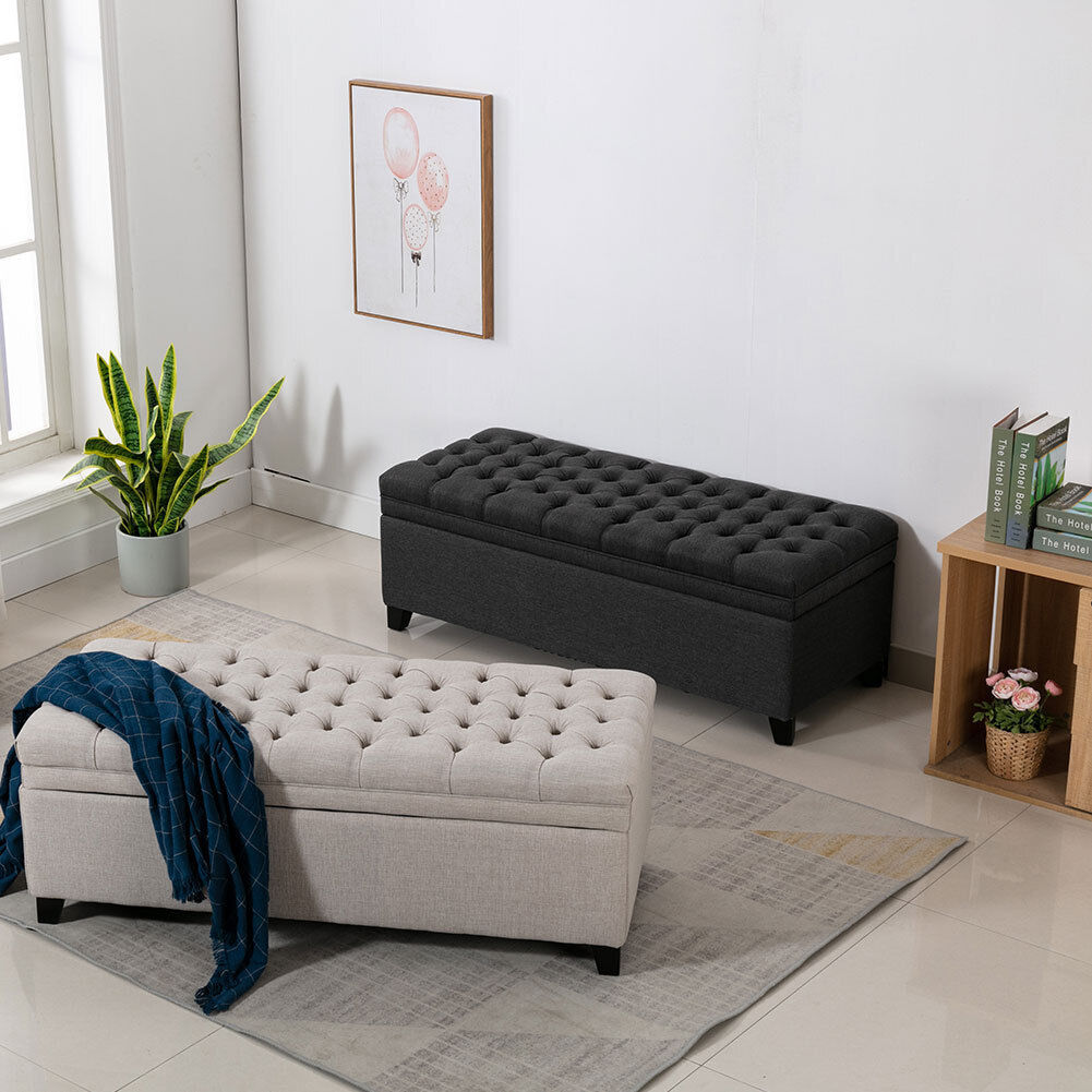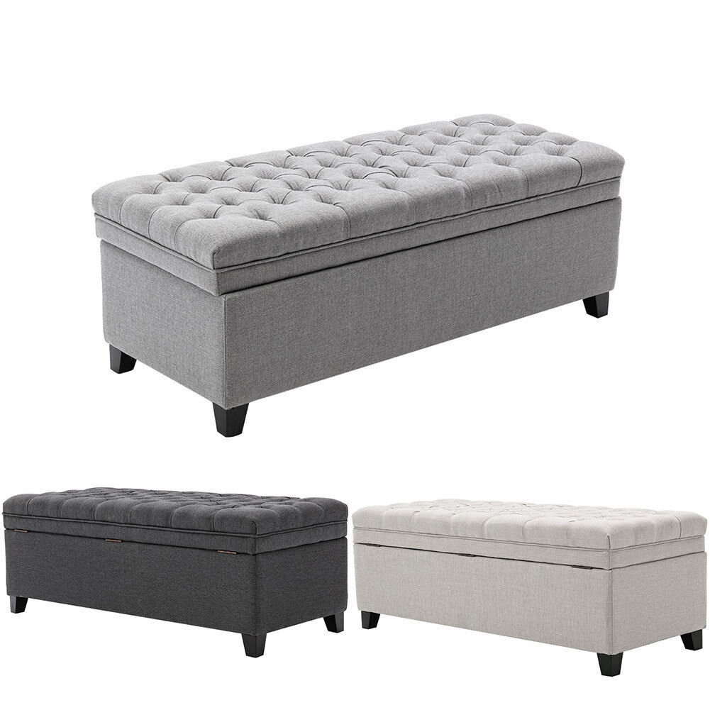 Large Linen Ottoman w/ Storage Button-Tufted Bedroom Bench Hinge End Of Stool