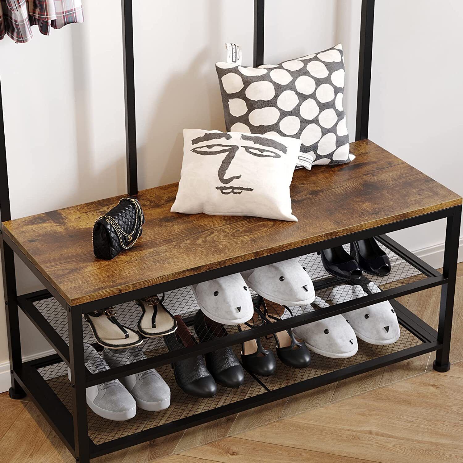 Large Rustic Coat Rack Stand Hall Tree with 12 Hooks and Shoe Bench Metal Frame