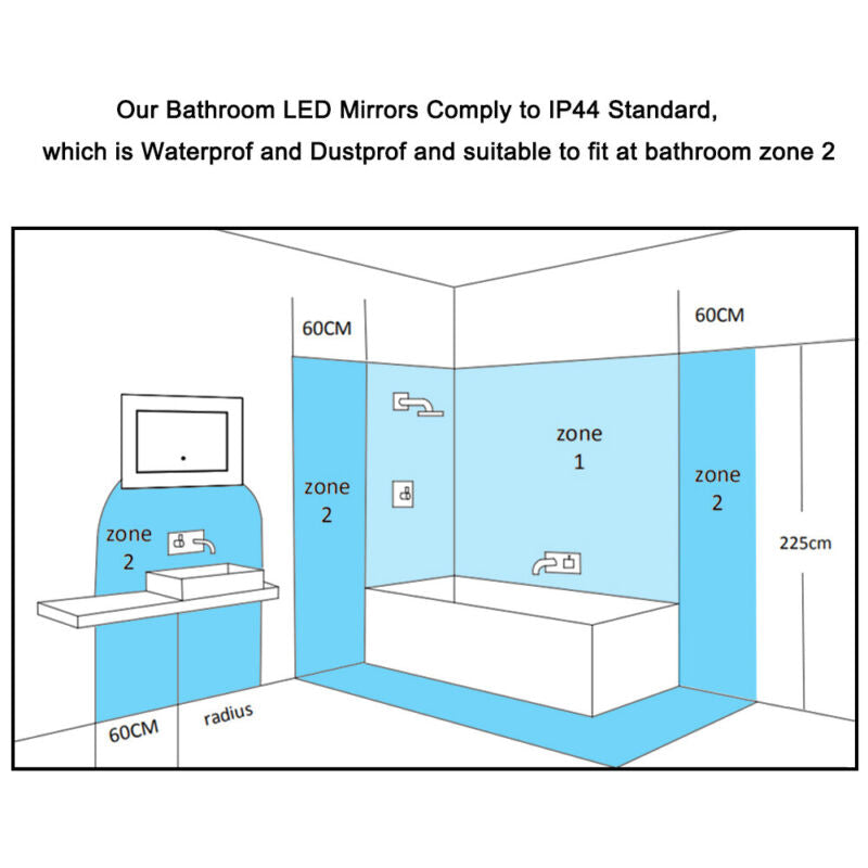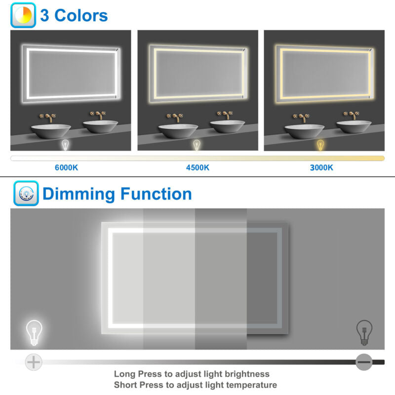 Features Backlit, Fogless, Heated, LED Lighted, Lighted, Touch Sensor, With Demister Pad, Energy Saving, Anti Fog, Retangular, Anti Mist, Lighting, Light up, illuminated, Bathroom mirror with led, Electric Bathroom Mirror, Fog Free, Hardwired, IP44 Rated, Lighted Mirror, Smart Touch, Waterproof, 3 Colors, Dimmable