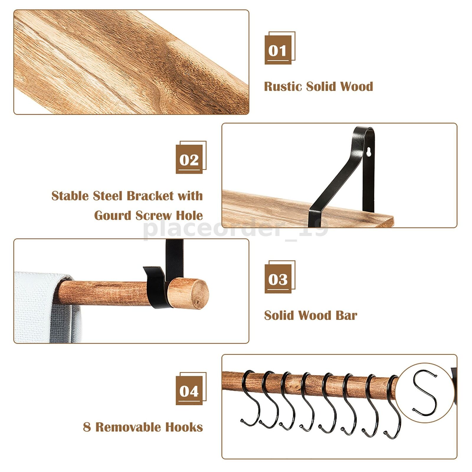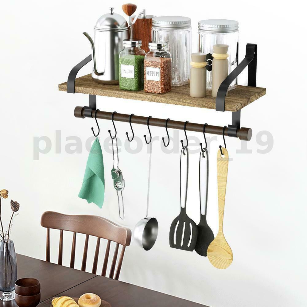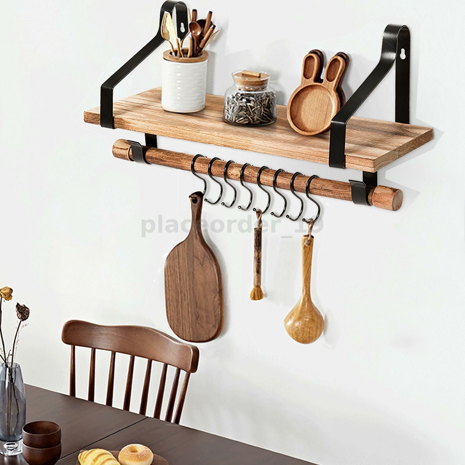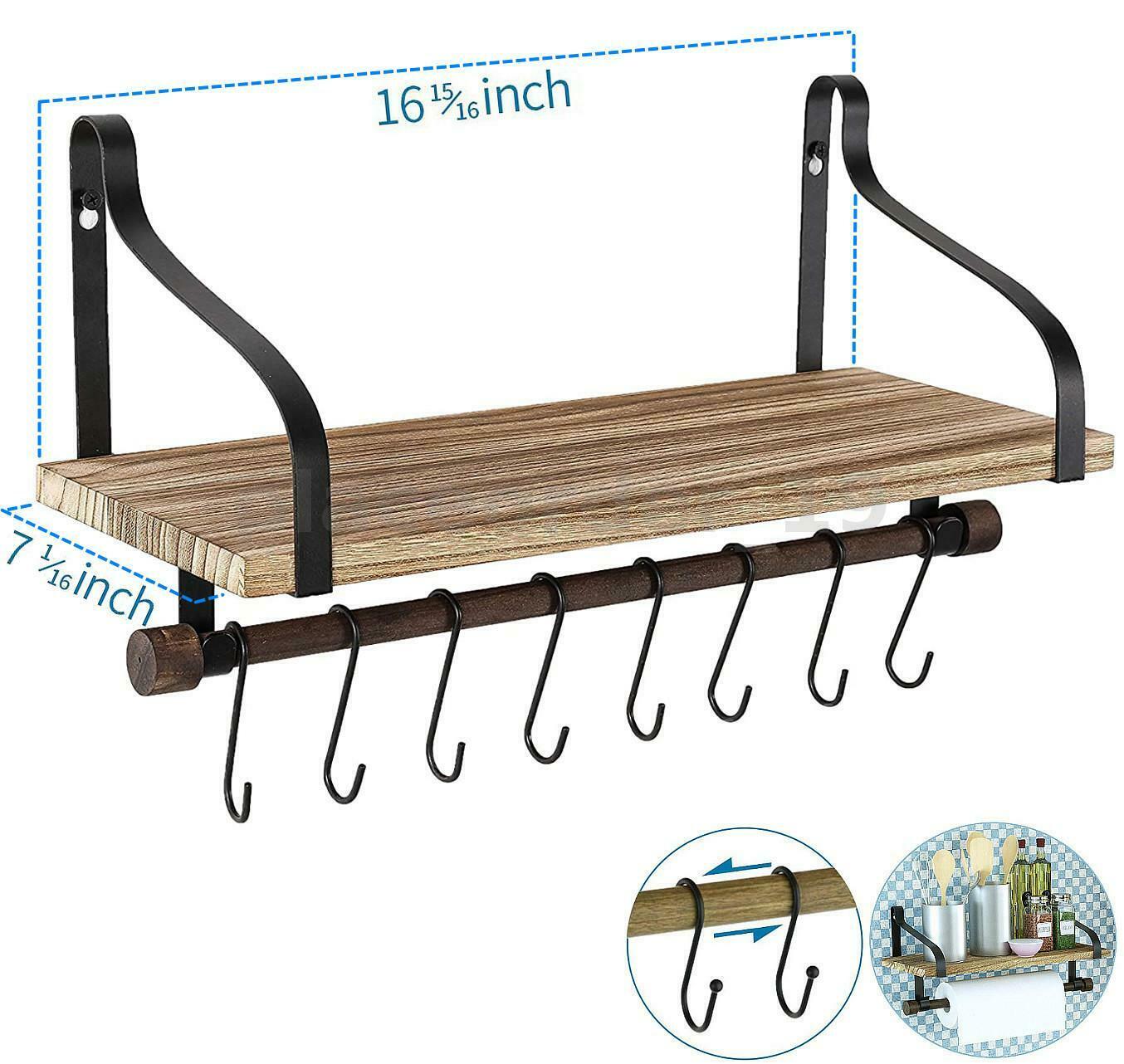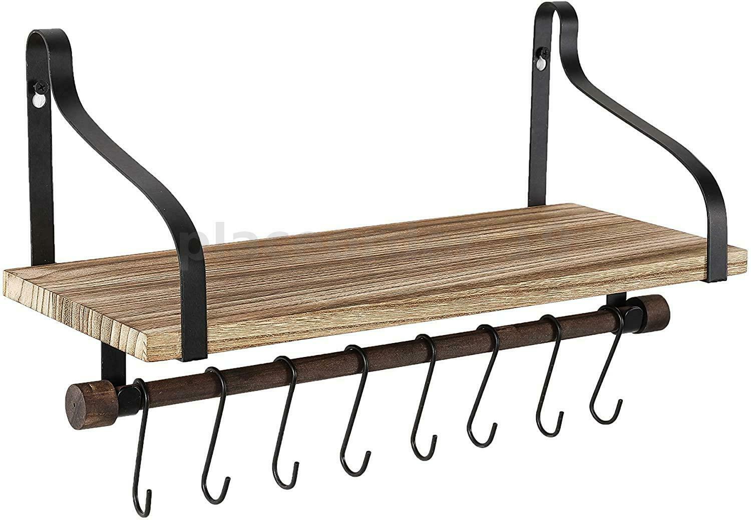 Large Wall Floating Shelf Kitchen Bathroom Storage Rustic Wood Rack With 8 Hooks