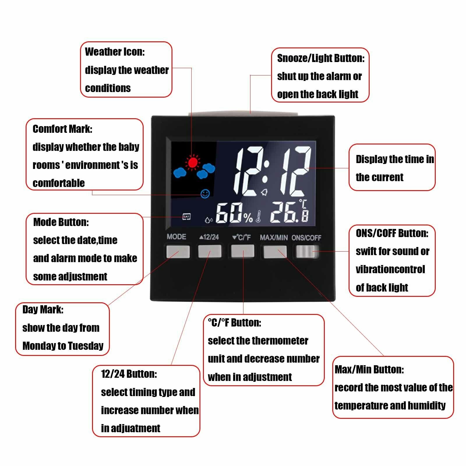 Features: 12 Hour Display, 24 Hour Display, Humidity Display, LED Display, Night Light, Snooze Function, Temperature Display