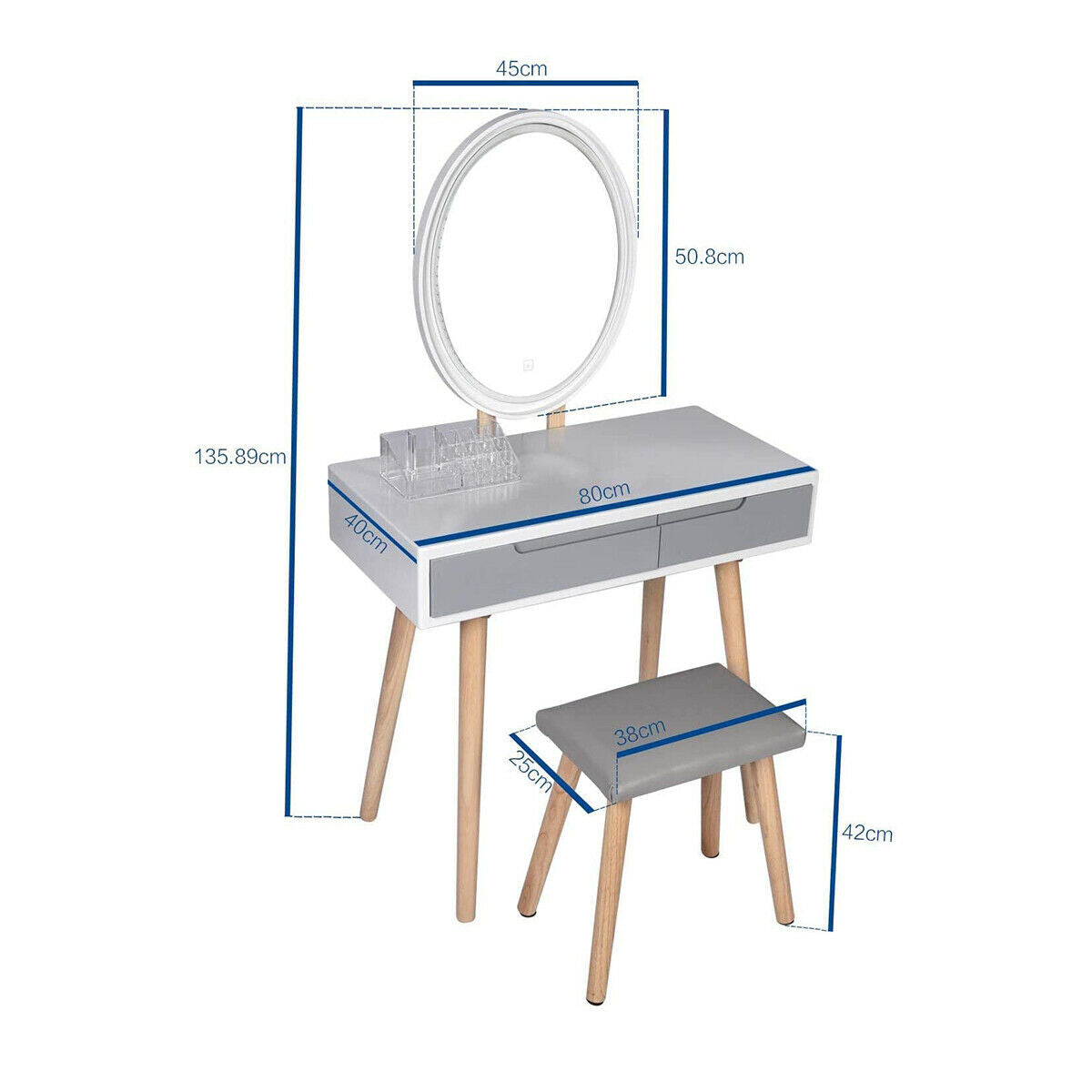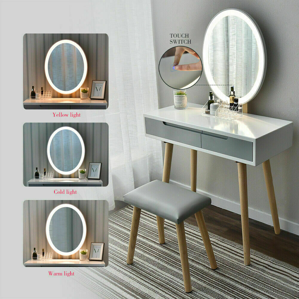 LED Lights Dressing Table Makeup Desk with Mirror 7 Drawers Stool Bedroom White