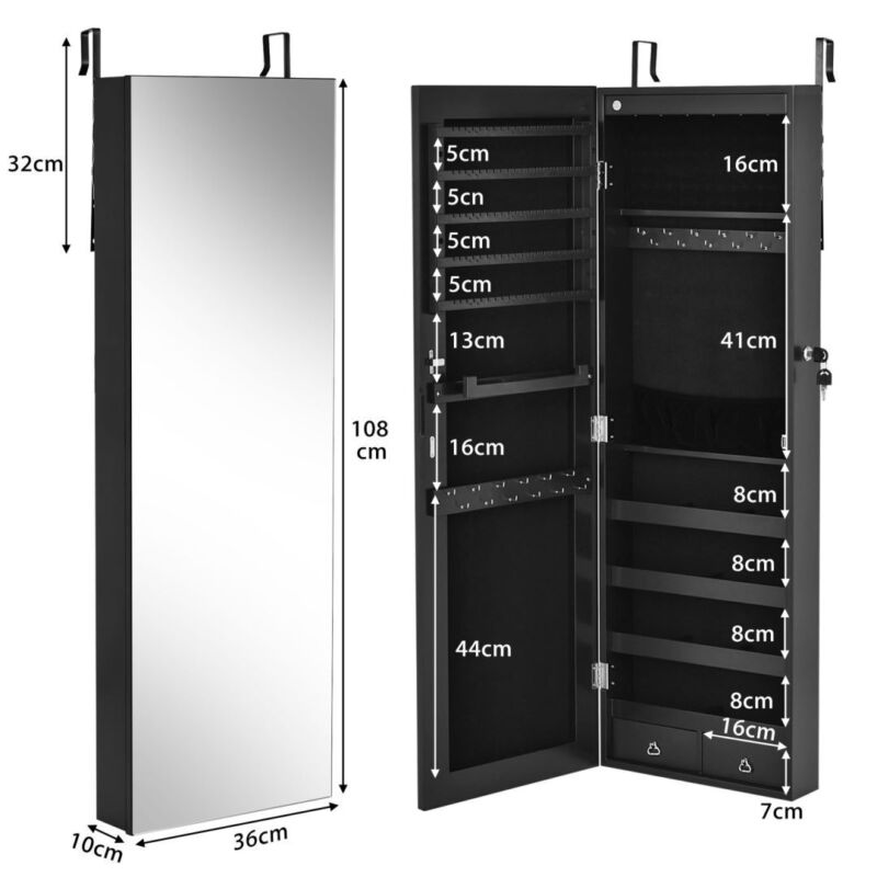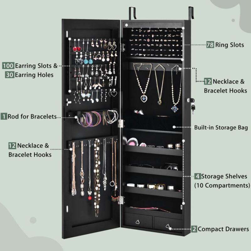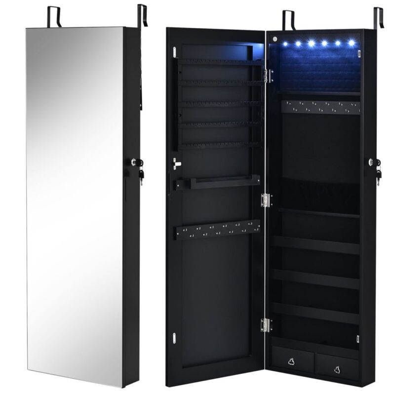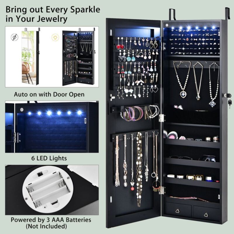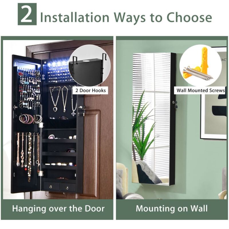 LED Lights Jewelry Cabinet Lockable Wall/Door Mounted Jewelry Armoire W/ Mirror