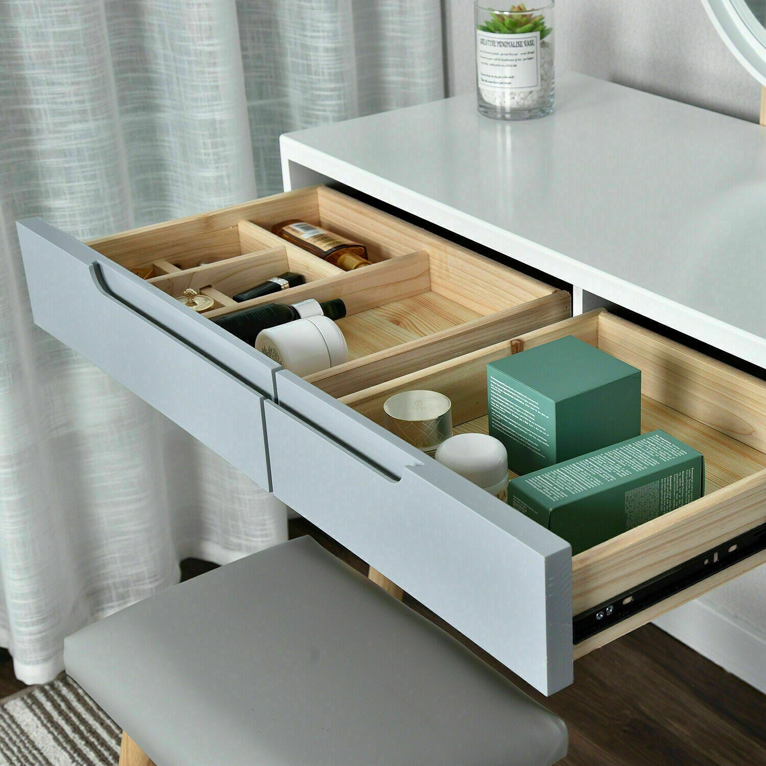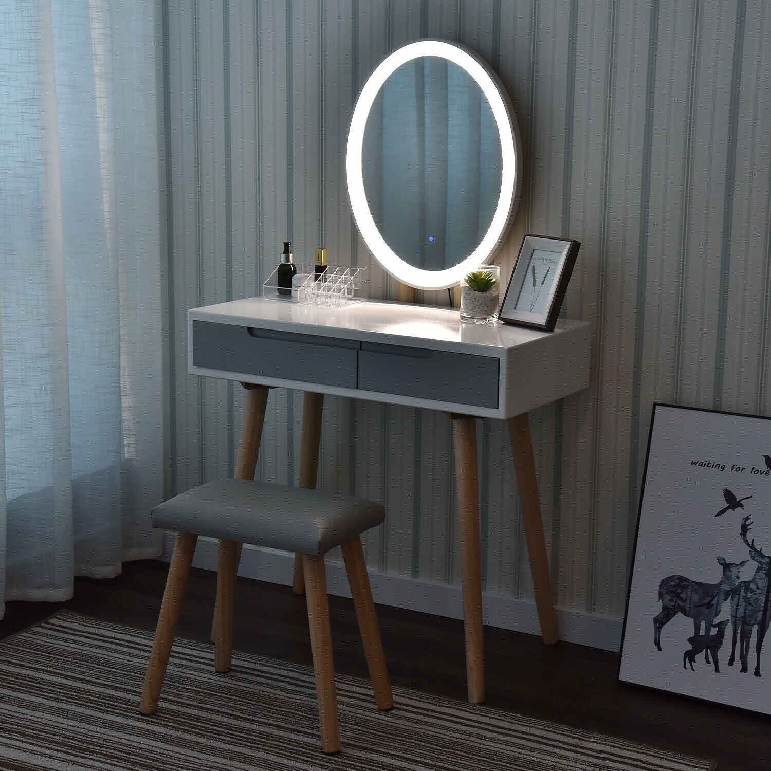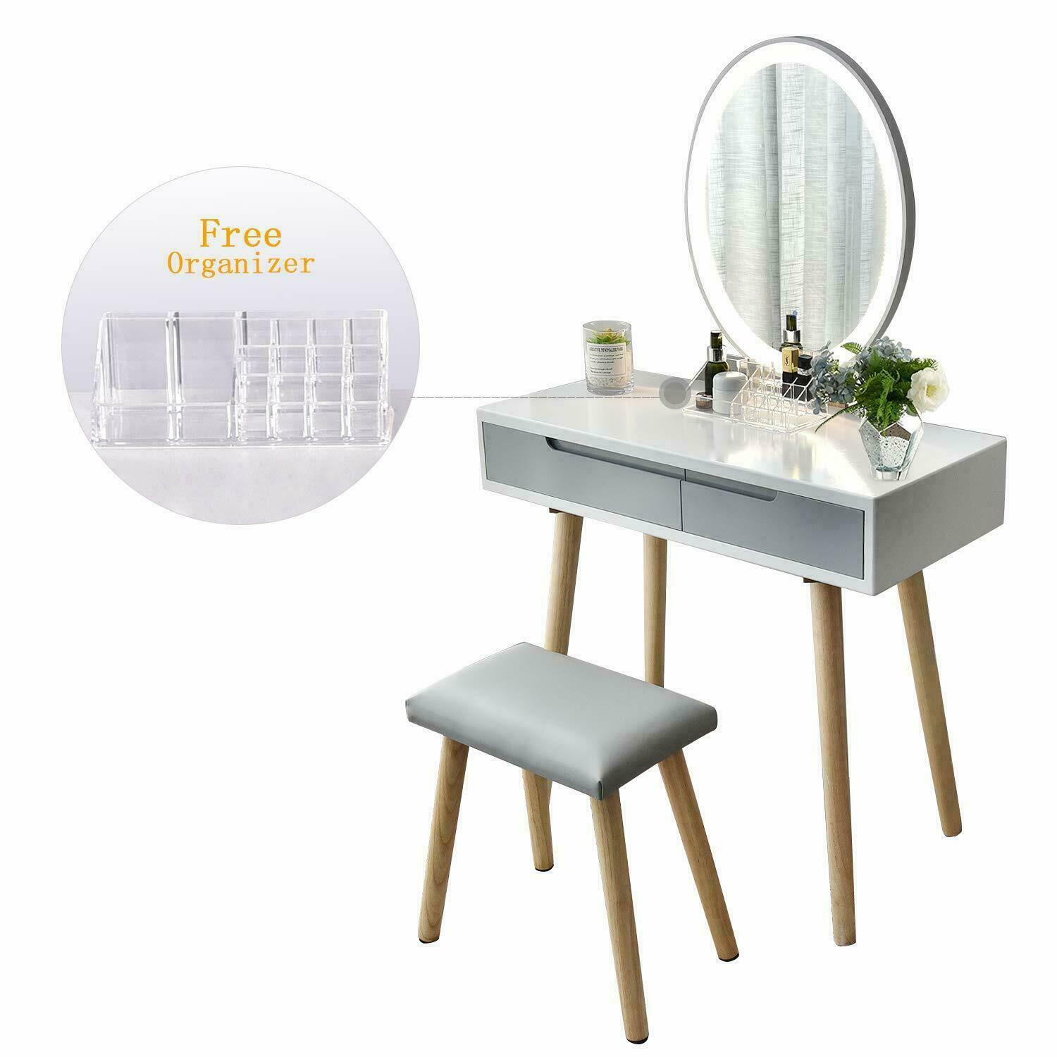 LED White Dressing Table Jewelry Makeup Desk Oval Mirror & Drawer Bedroom Modern