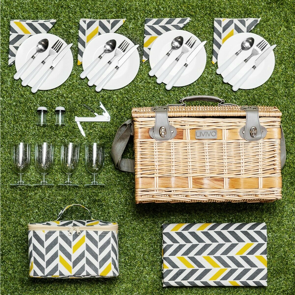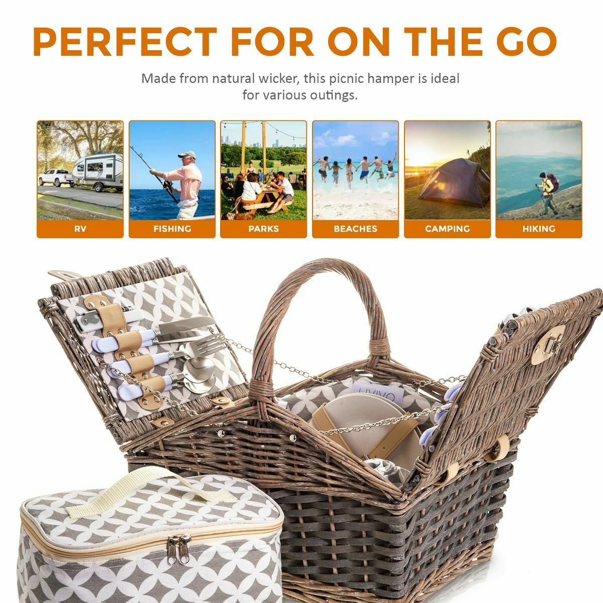 LIVIVO 4 PERSON TRADITIONAL PICNIC WICKER HAMPER WILLOW BASKET w COOLER BAG