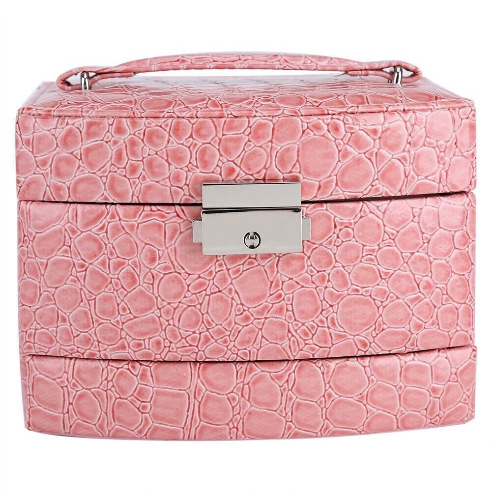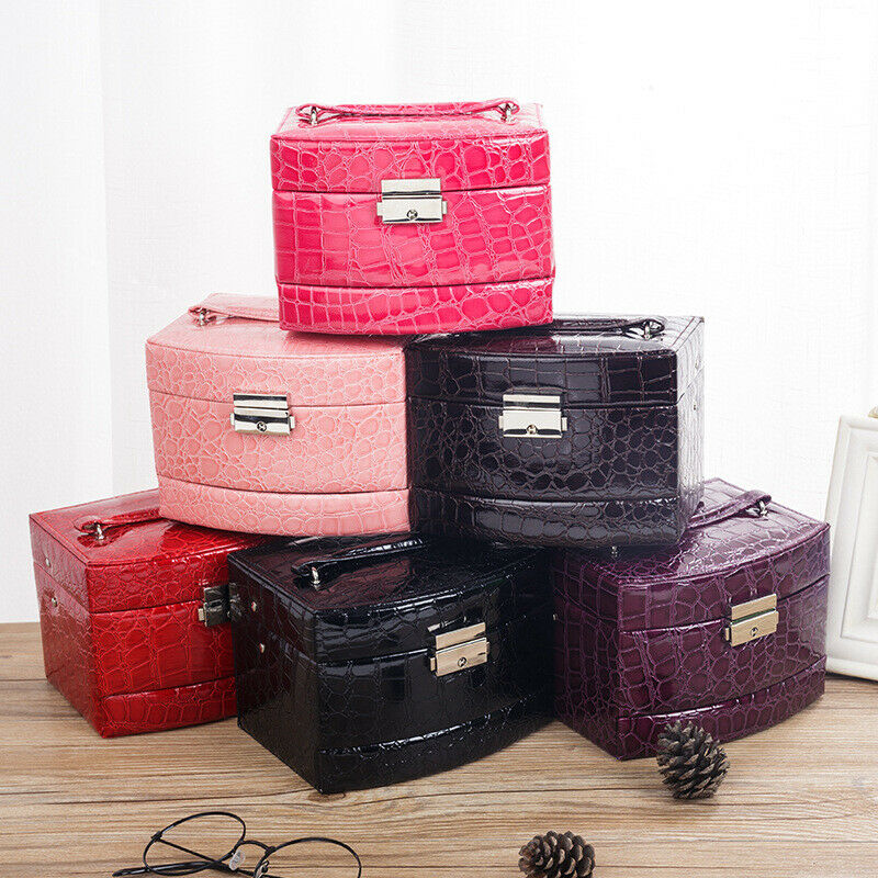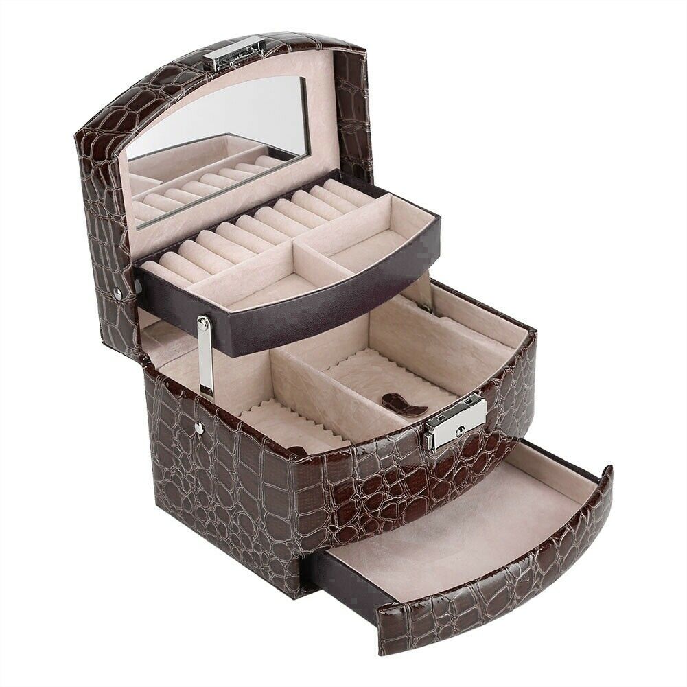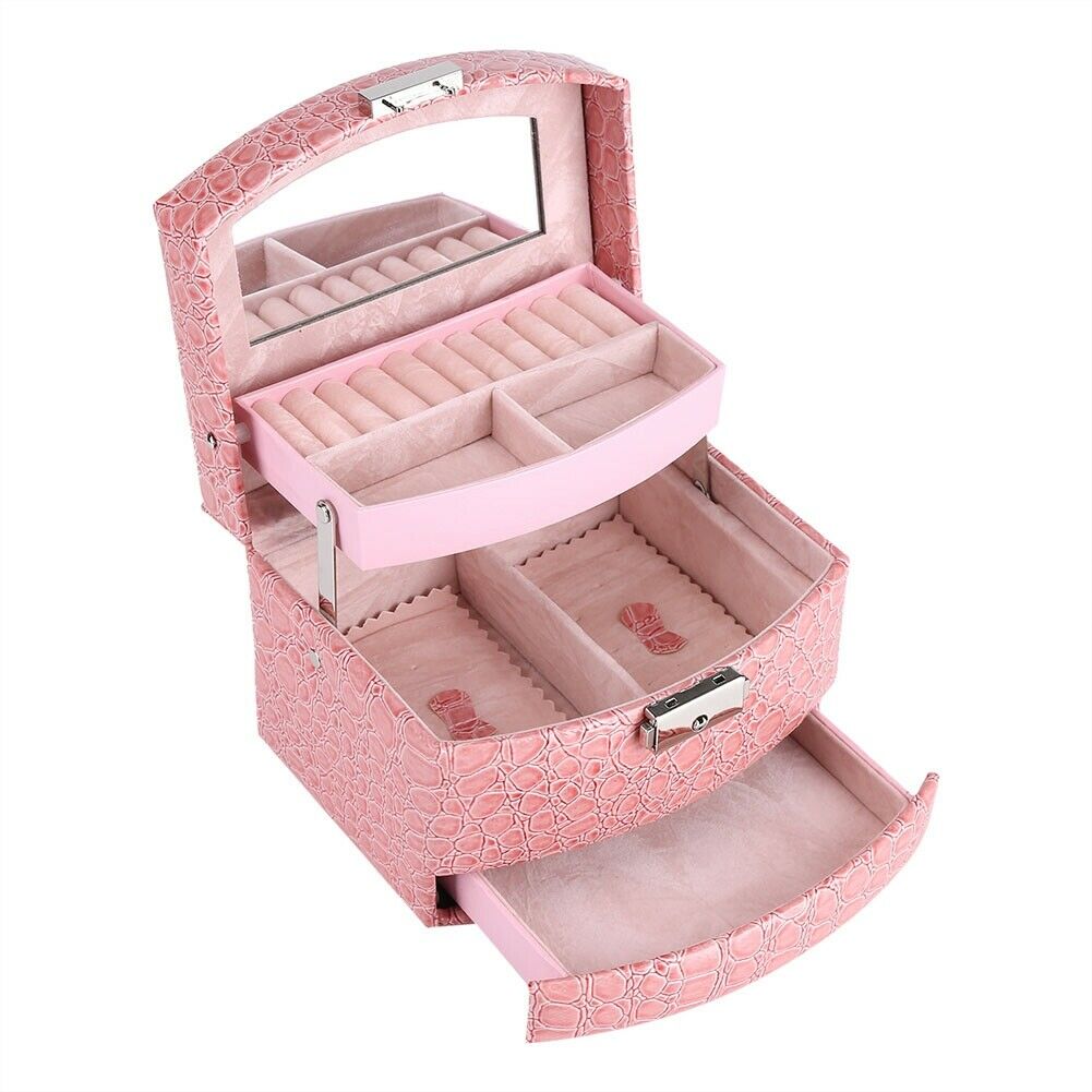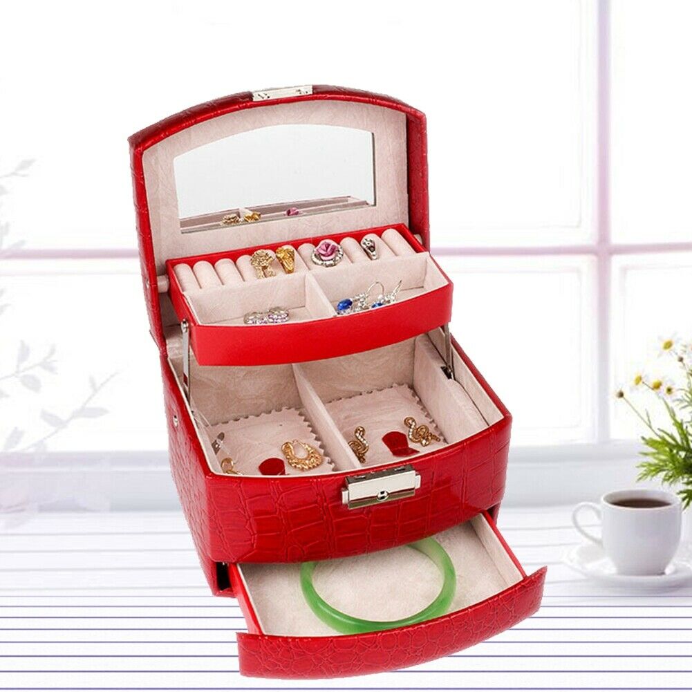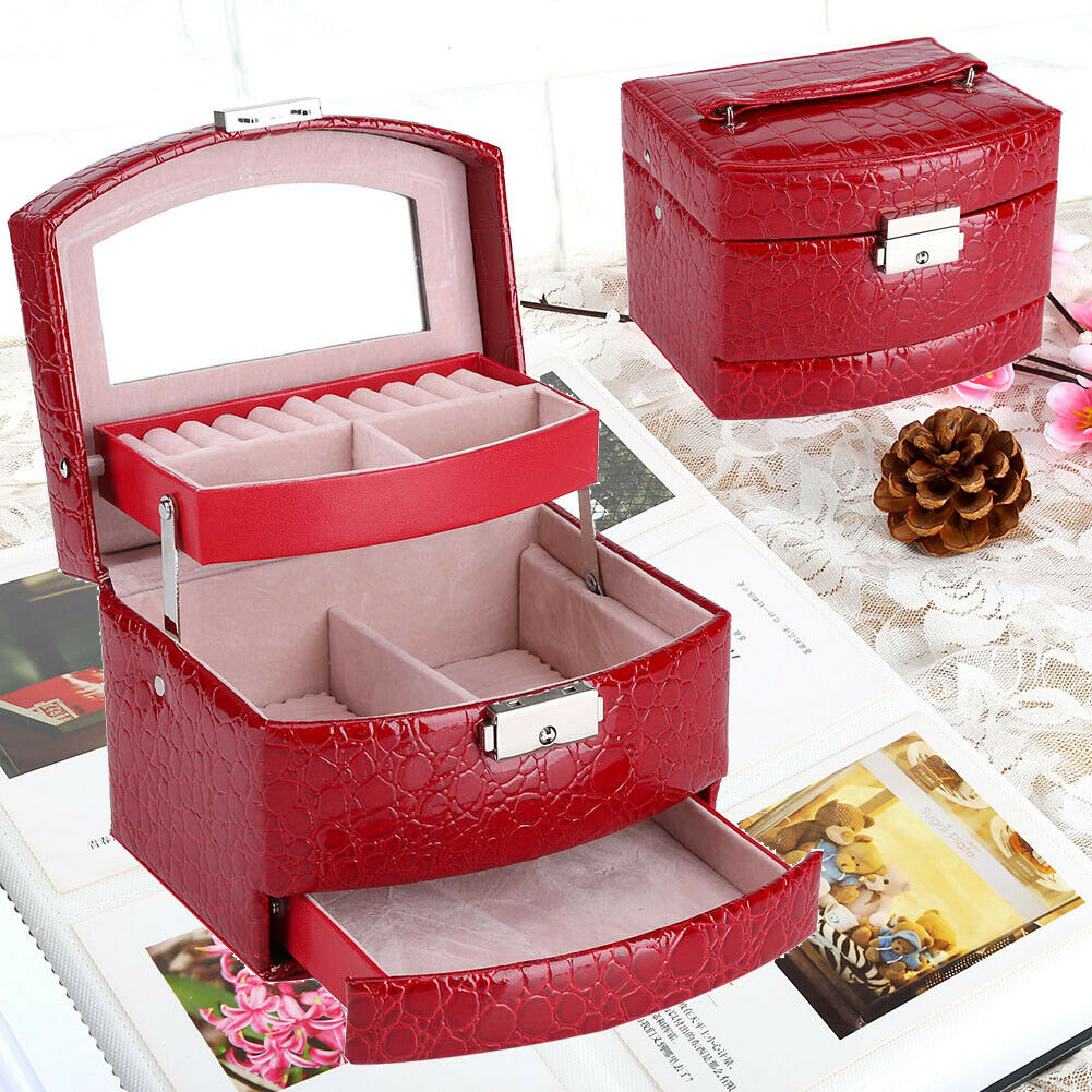 LOCKABLE 3 LAYERS BLACK JEWELLERY BOX LEATHER FINISH JEWELRY STORAGE 2 DRAWER