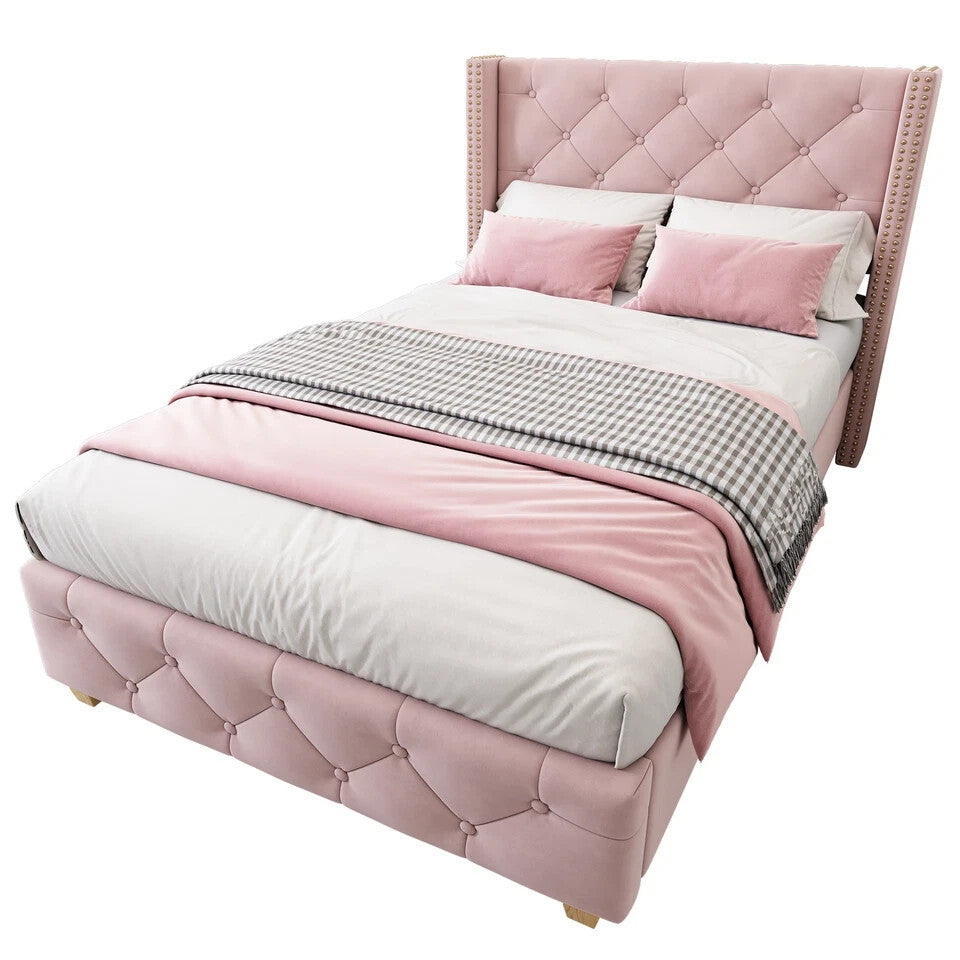 Luxury Upholstered Single Bed with Slatted Frame & Elegant Headboard Button Pink
