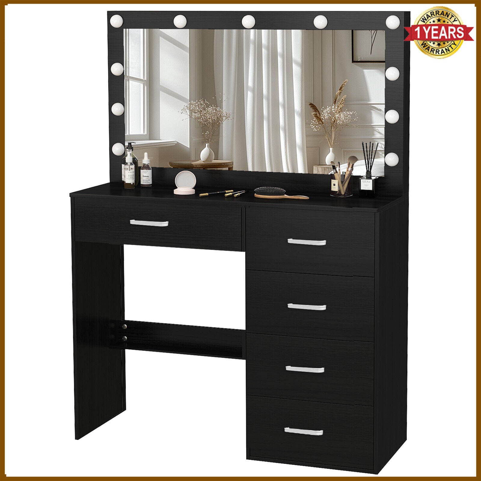 Makeup Desk Dressing Table Vanity Set With Large Mirror 11 LED Bulbs & 5 Drawers