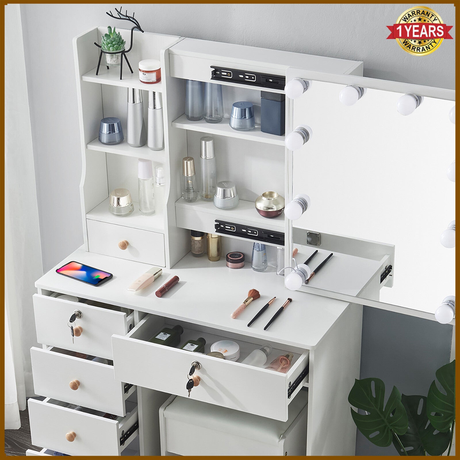 Makeup Desk Vanity Stool Dressing Table with 10 LED Lights Sliding Mirror Set