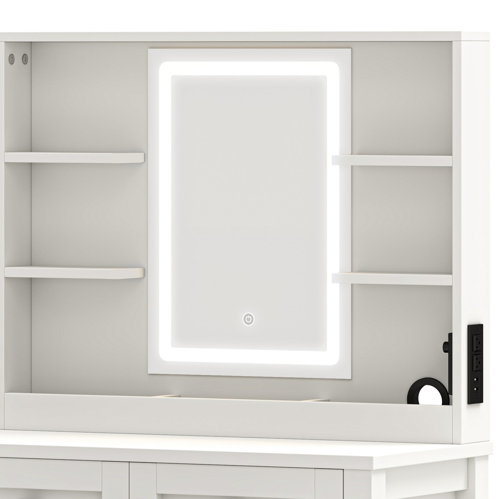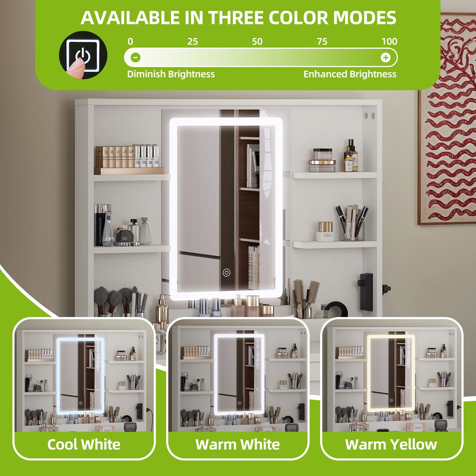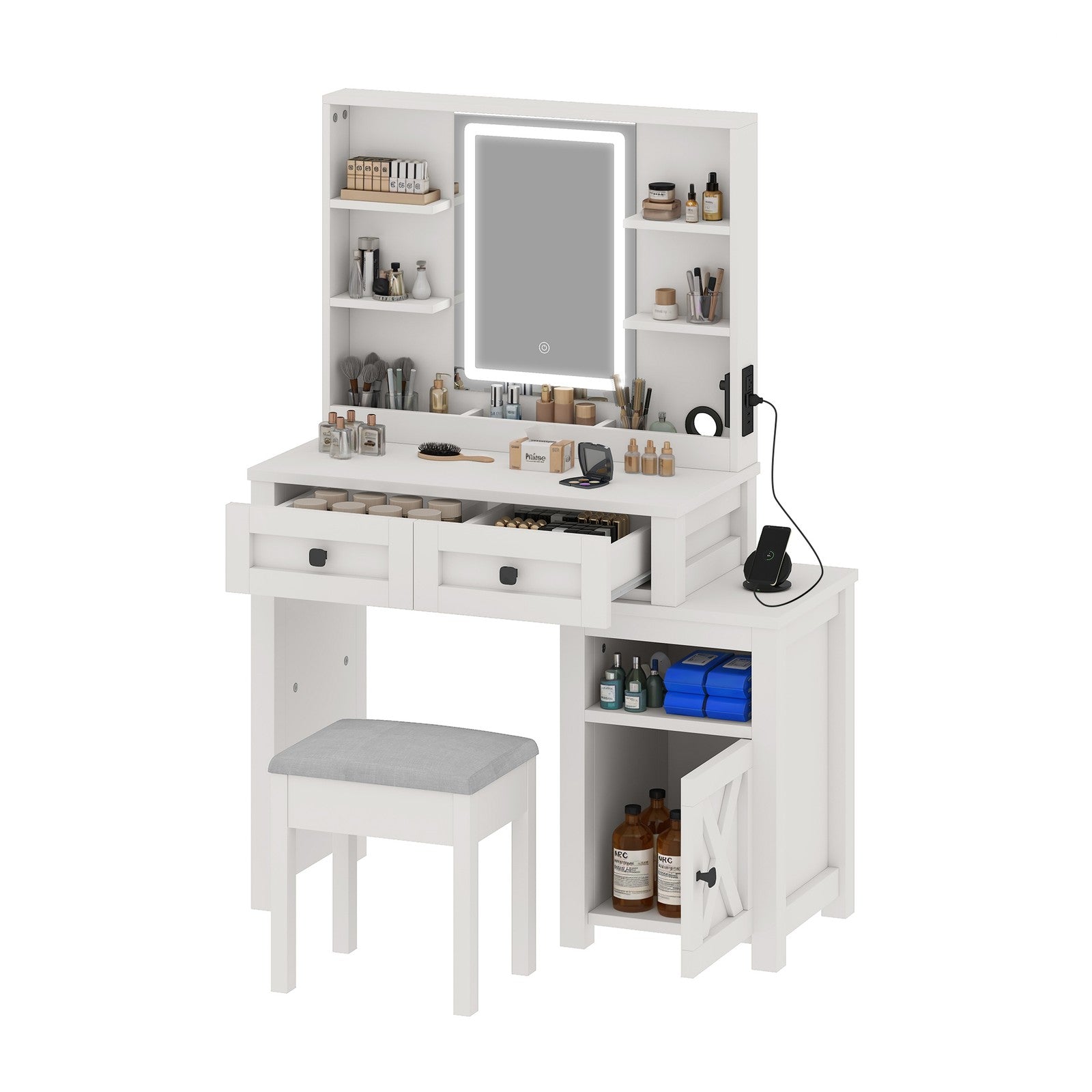 Makeup Desk with LED Lights, Cabinet, 2 Drawers, Shelves, for Bedroom