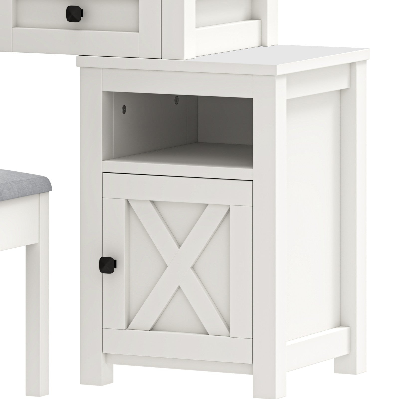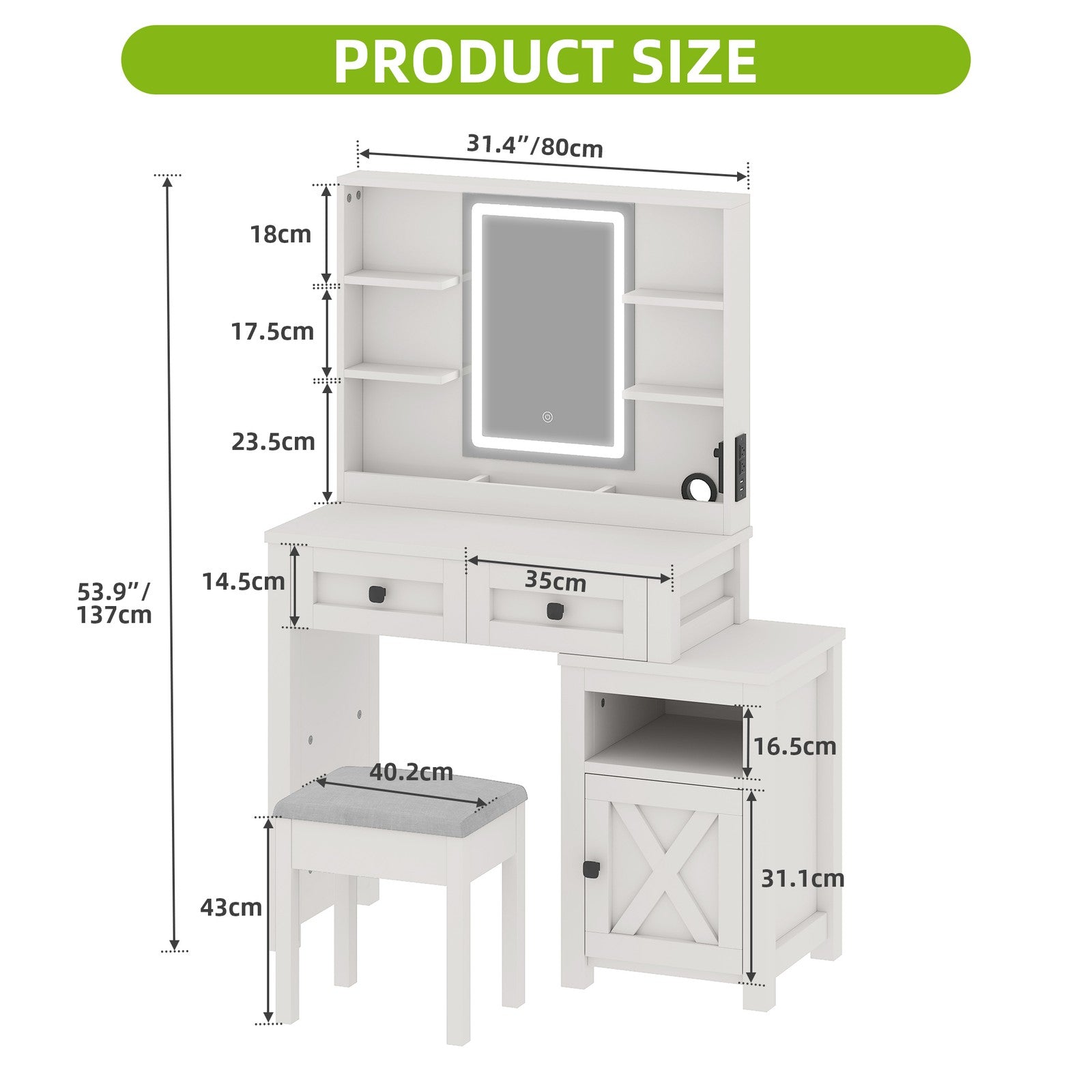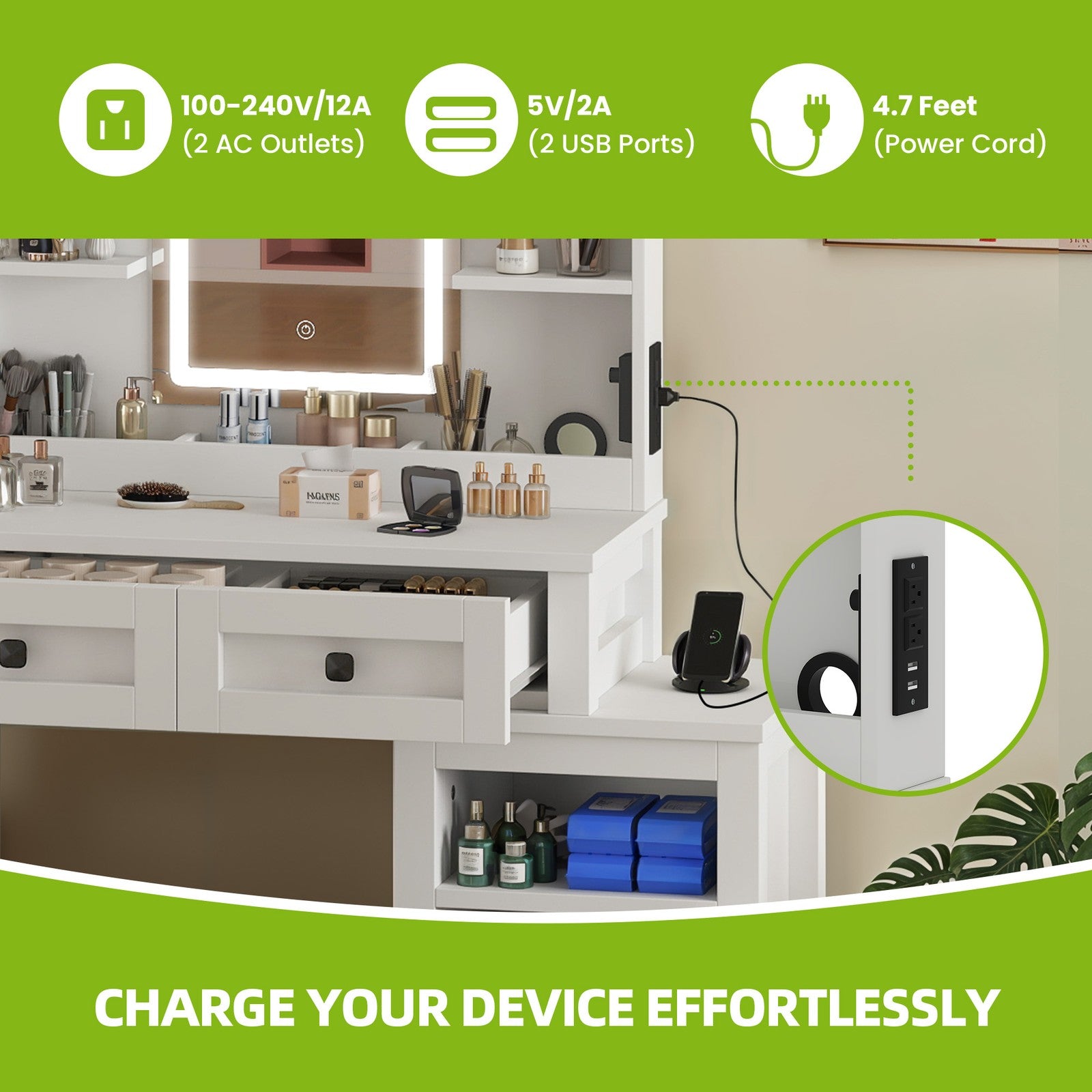 Makeup Desk with LED Lights, Cabinet, 2 Drawers, Shelves, for Bedroom