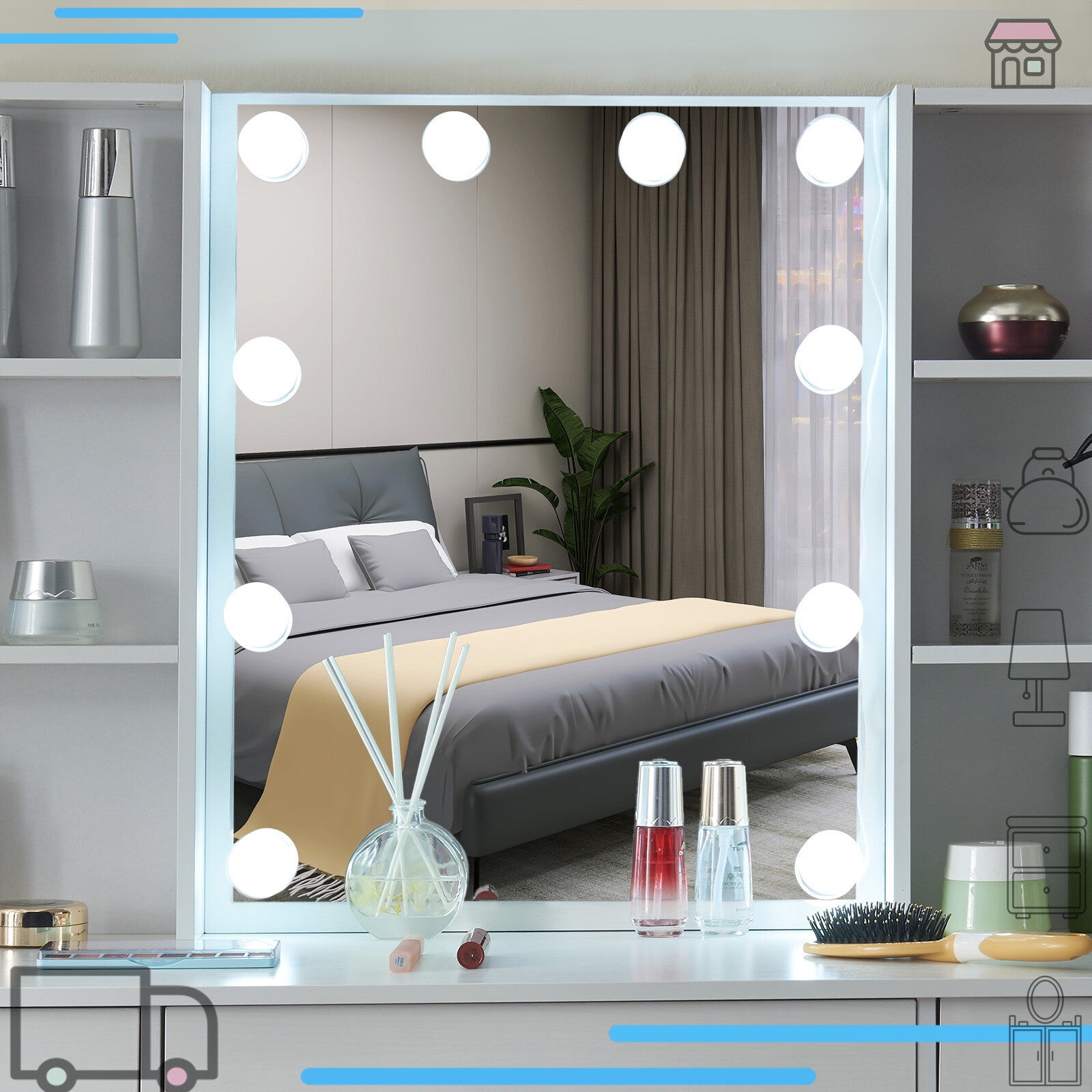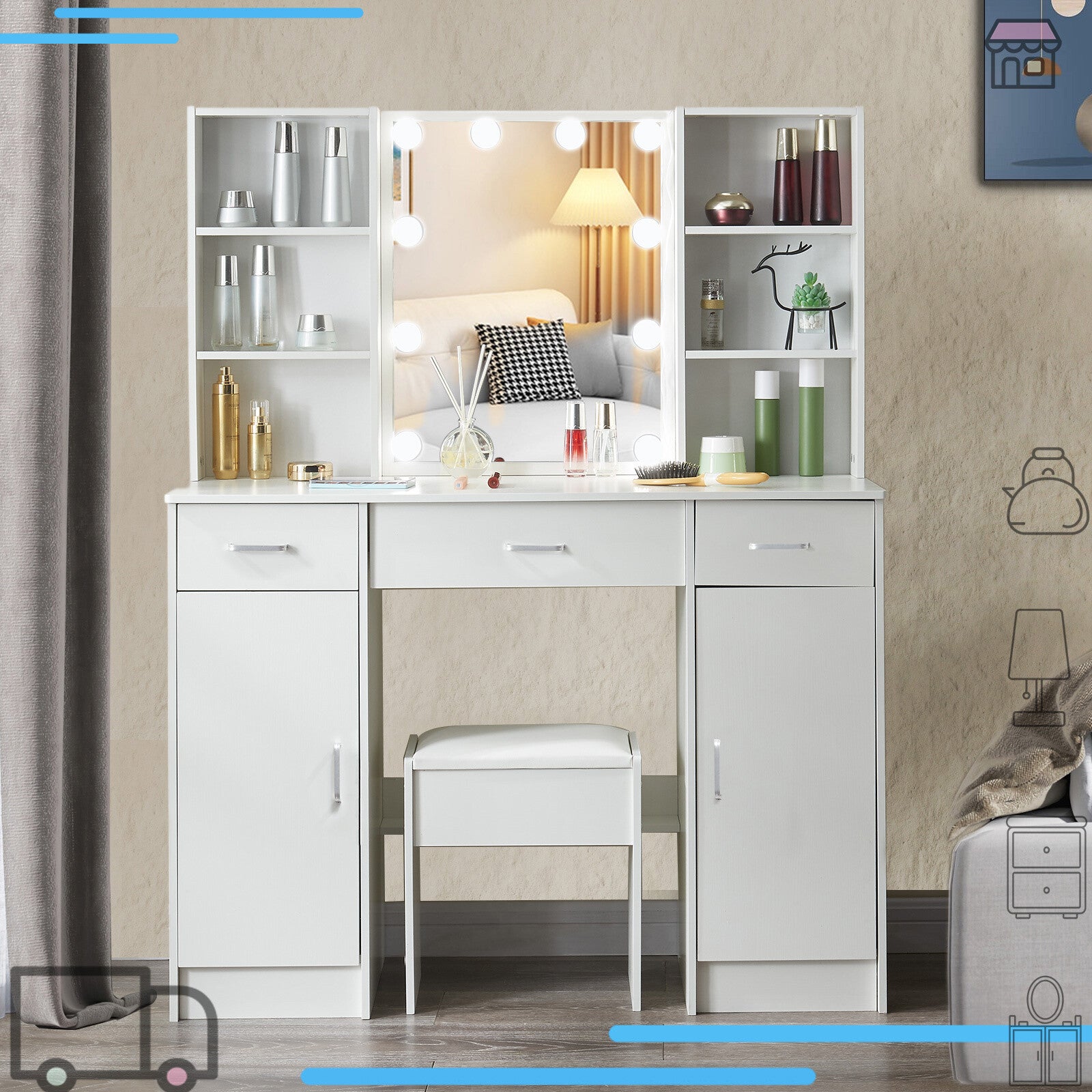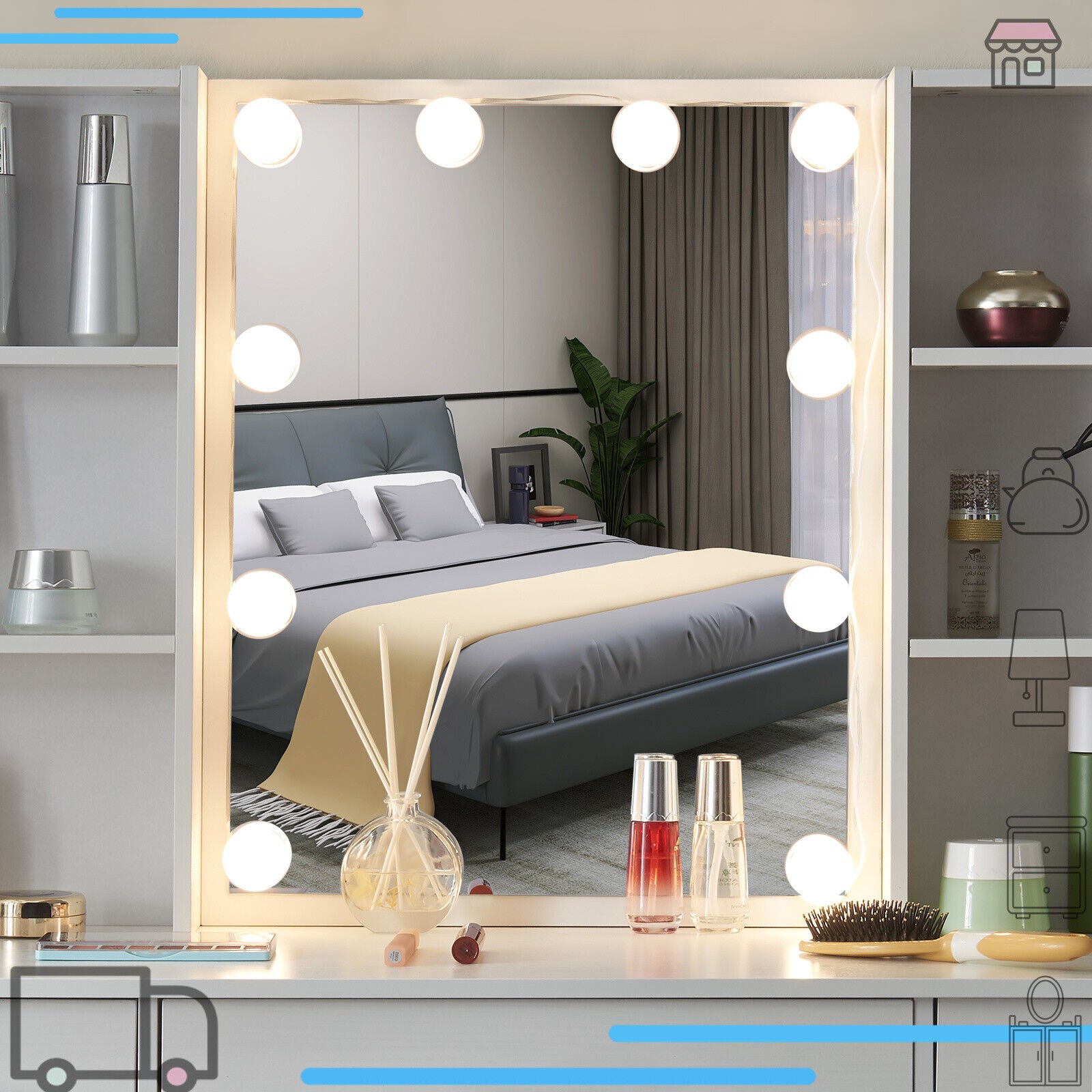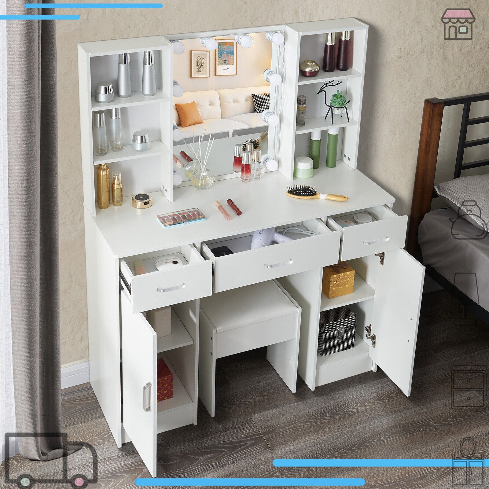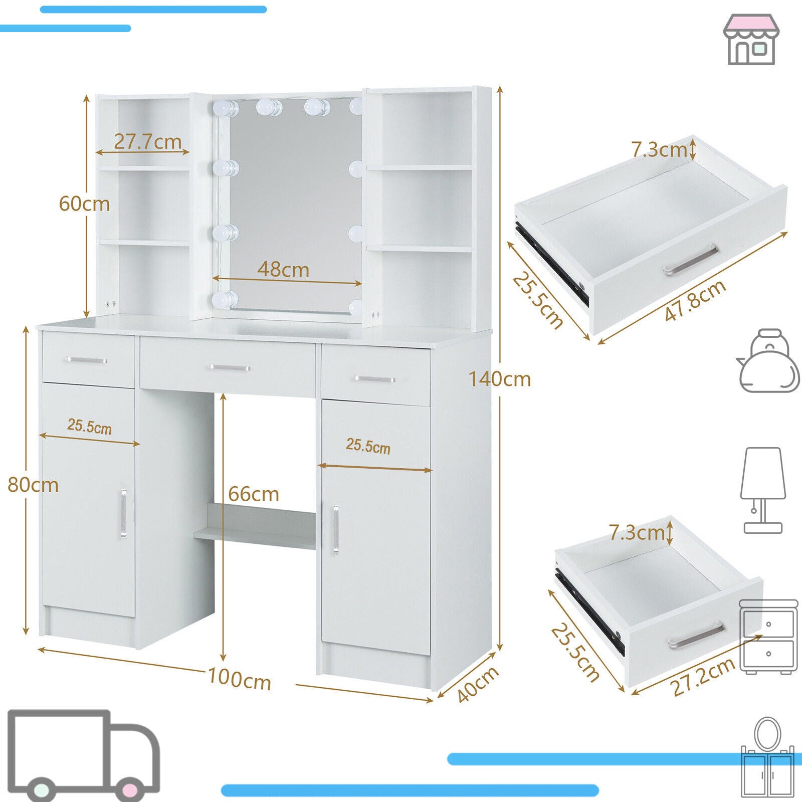 Makeup Dressing Table Set 10 LED Lighted Mirror Vanity Desk w/ Stool 3 Drawers