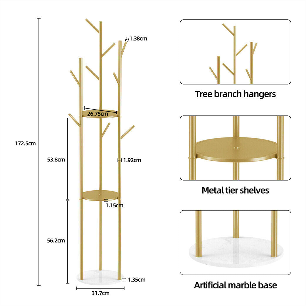 Marble Gold Coat Rack 9 Hooks Clothes Rail Free Standing Hanger w/ Shelf Storage