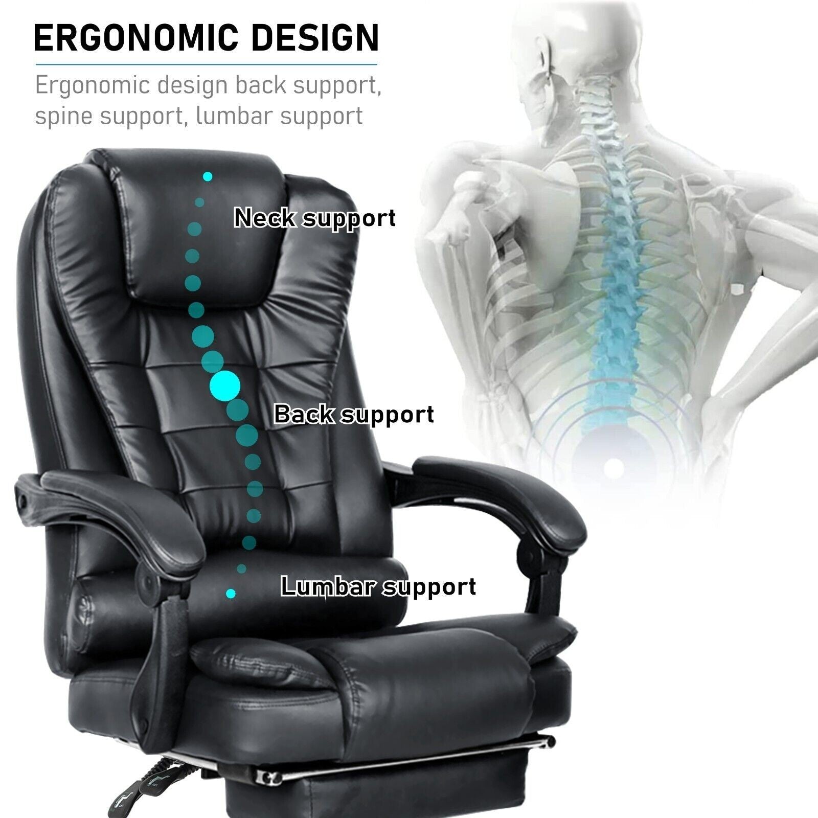 Recliner Office Chair, 8 Point Massage Chair, 2 Point Massage Chair, Casters/Wheels, Chair Gas Lift, Ergonomic, Fire Retardant, Heavy Duty, High Back, Lumbar Support, Padded Arms, Swivel, Tilt Control, Tilt Lock