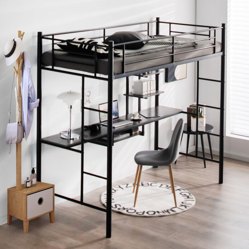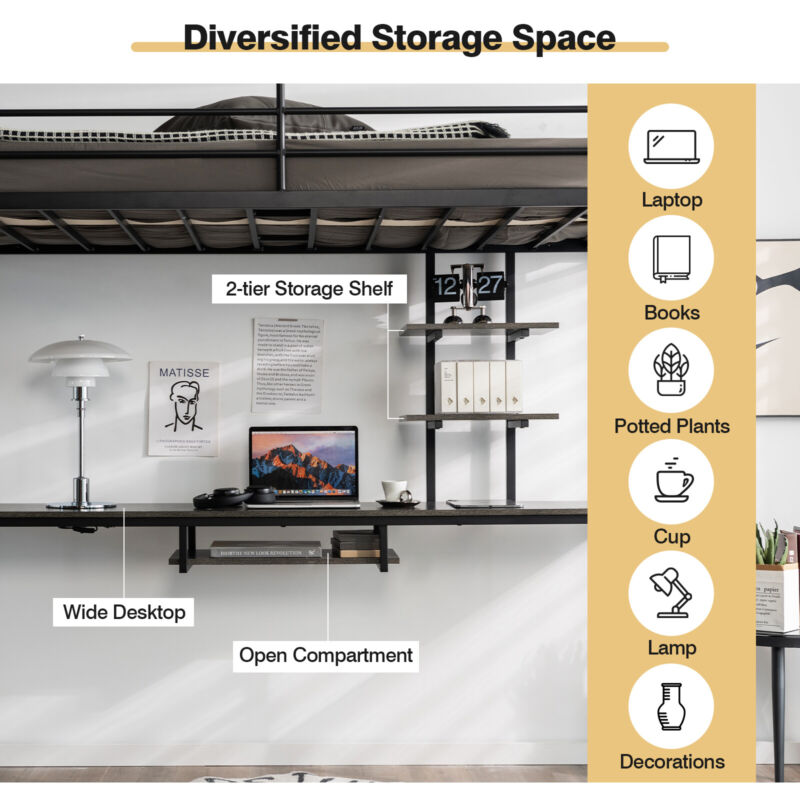 Metal Bunk Bed w/Desk Shelves and Safety Guardrail 2 Ladders Loft Bed Frame