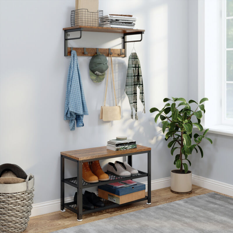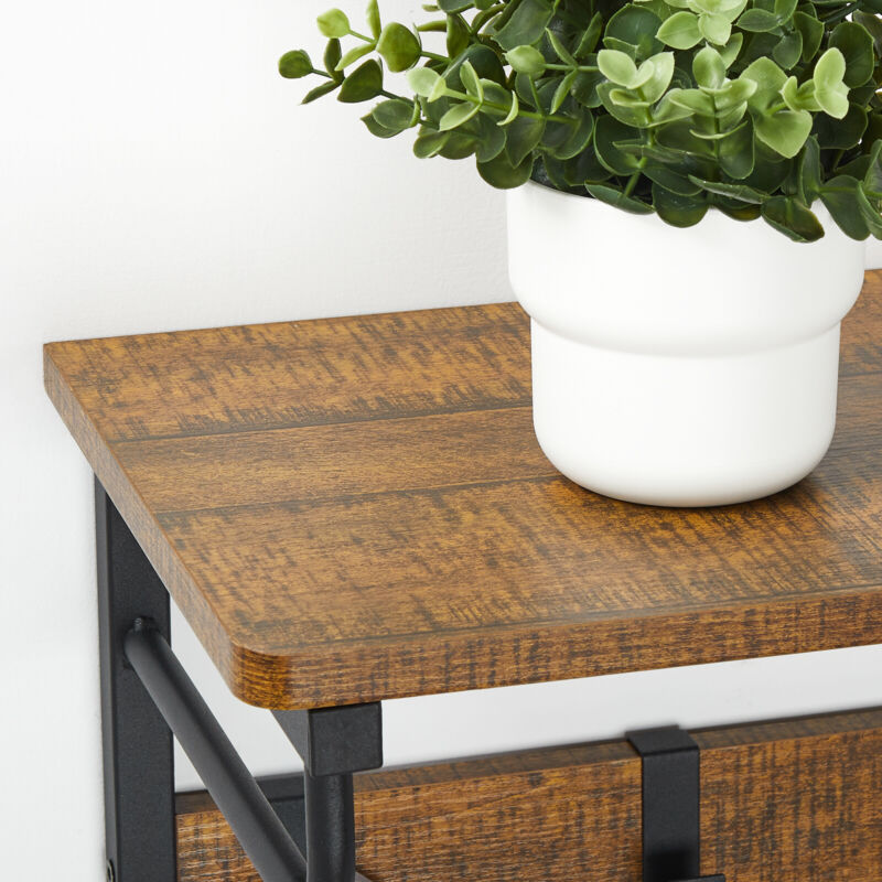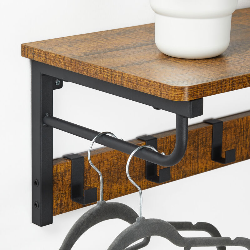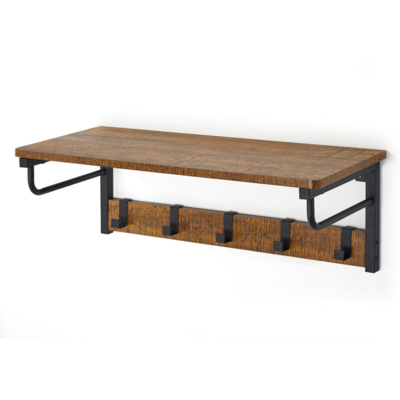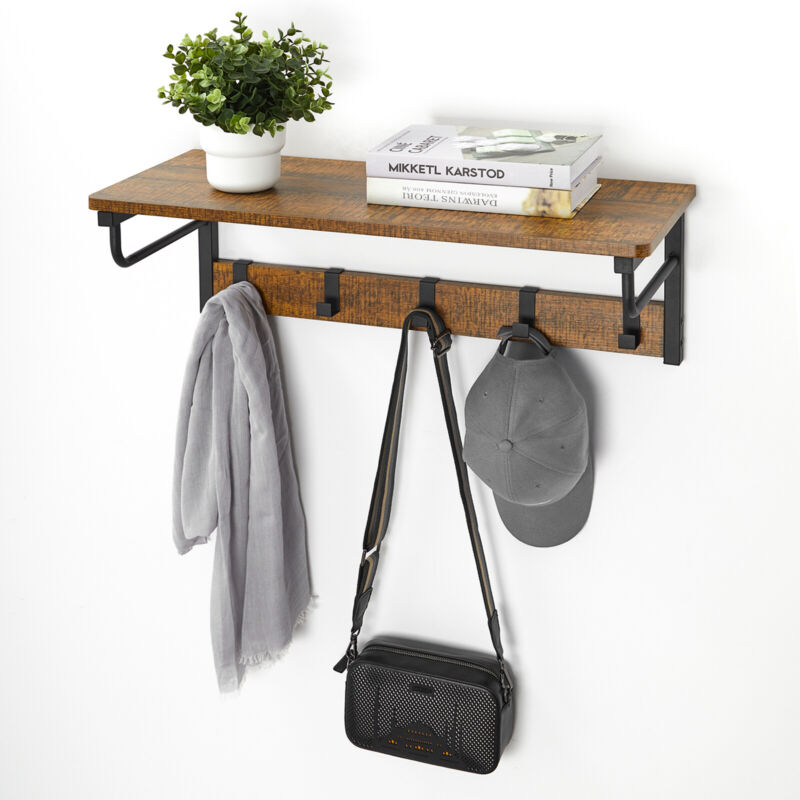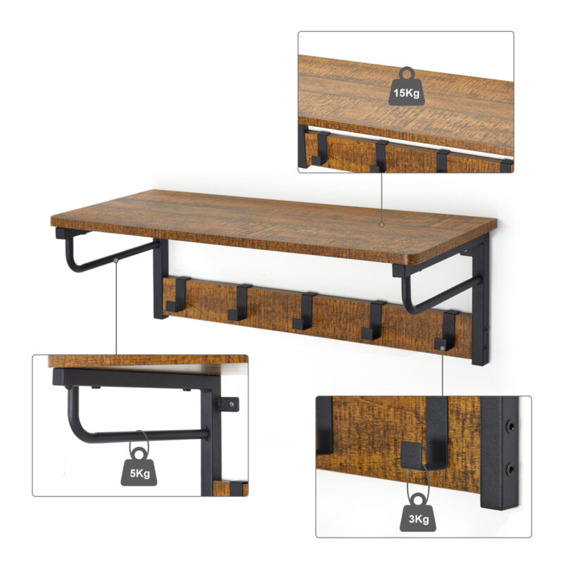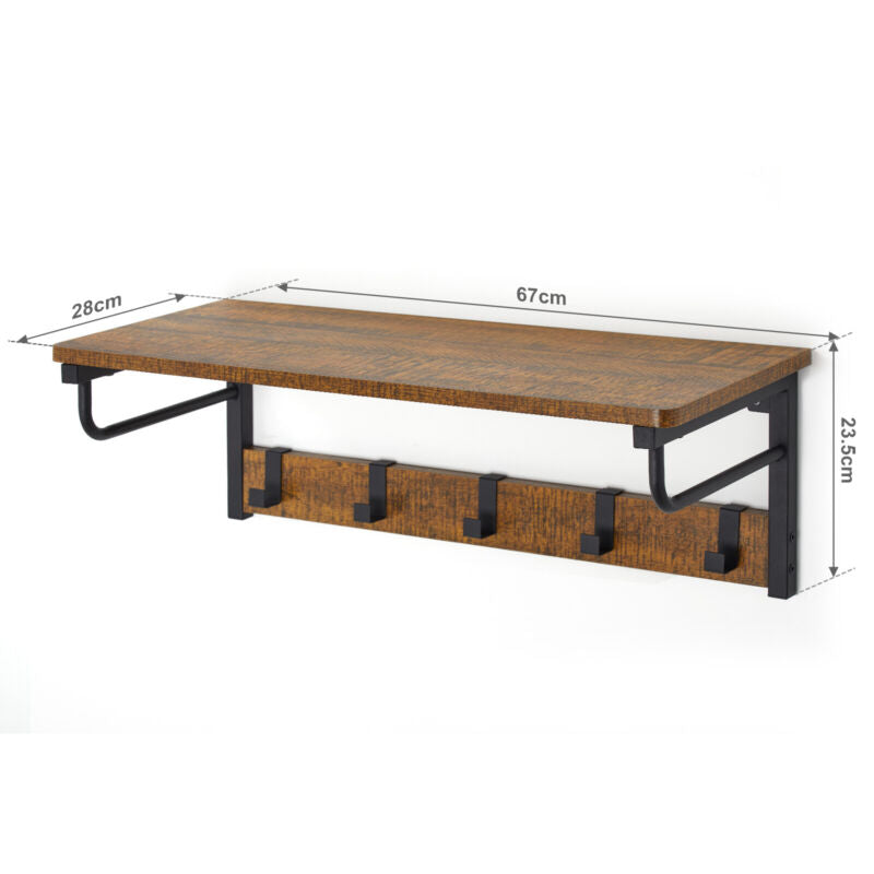Metal Coat Rack with 5 Hooks & Shelf Wooden Rack Clothes Hat Hanger Wall Mounted
