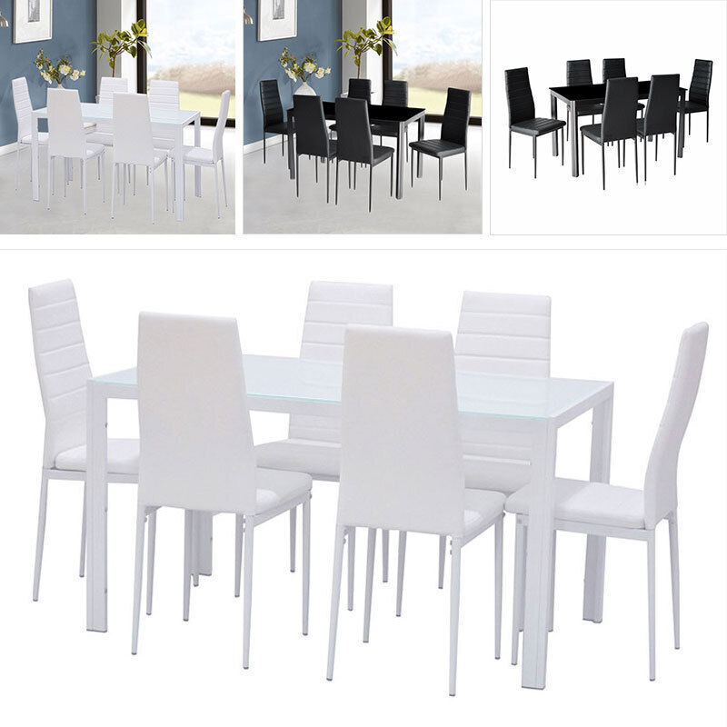 Metal Framed Tempered Glass Top Dining Table Faux Leather Chairs Set Black/White