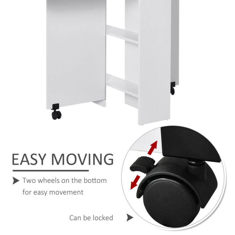Mobile Drop Leaf Dining Table Folding Desk w/ 2 wheels Storage Shelves White