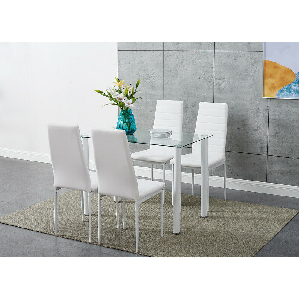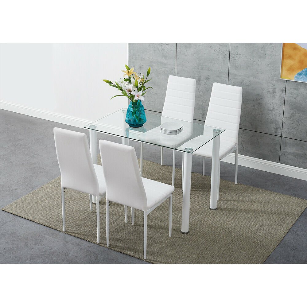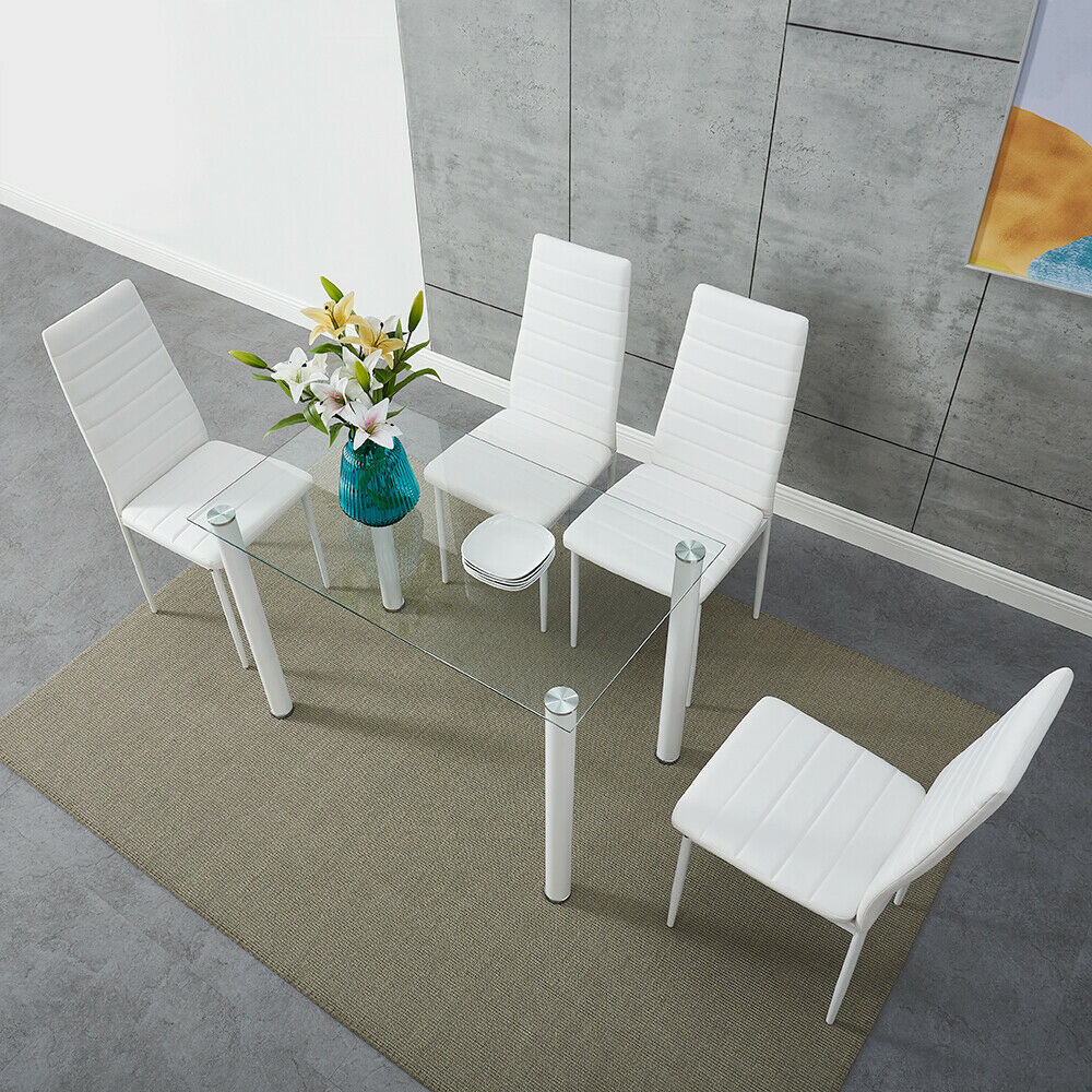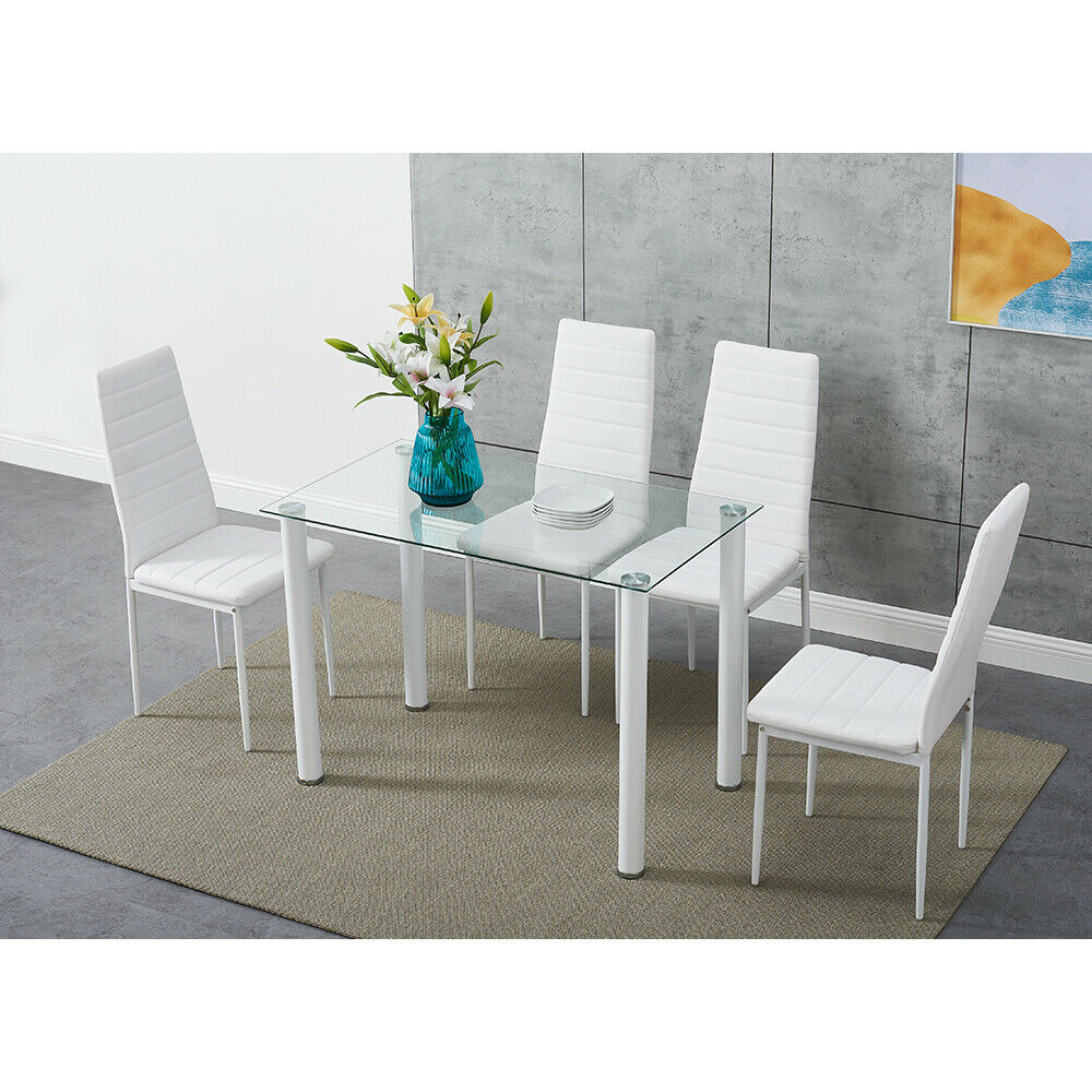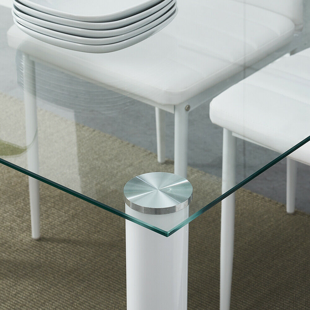 Modern Clear Glass Dining Table and 4 Padded Chairs Set in White Home Furniture