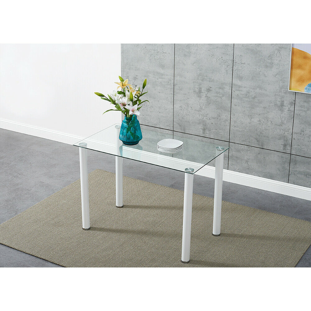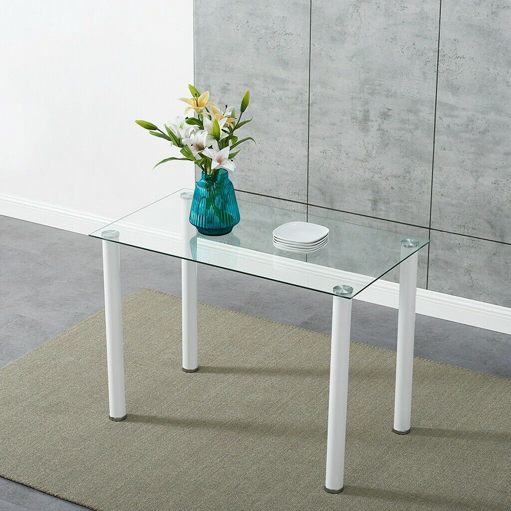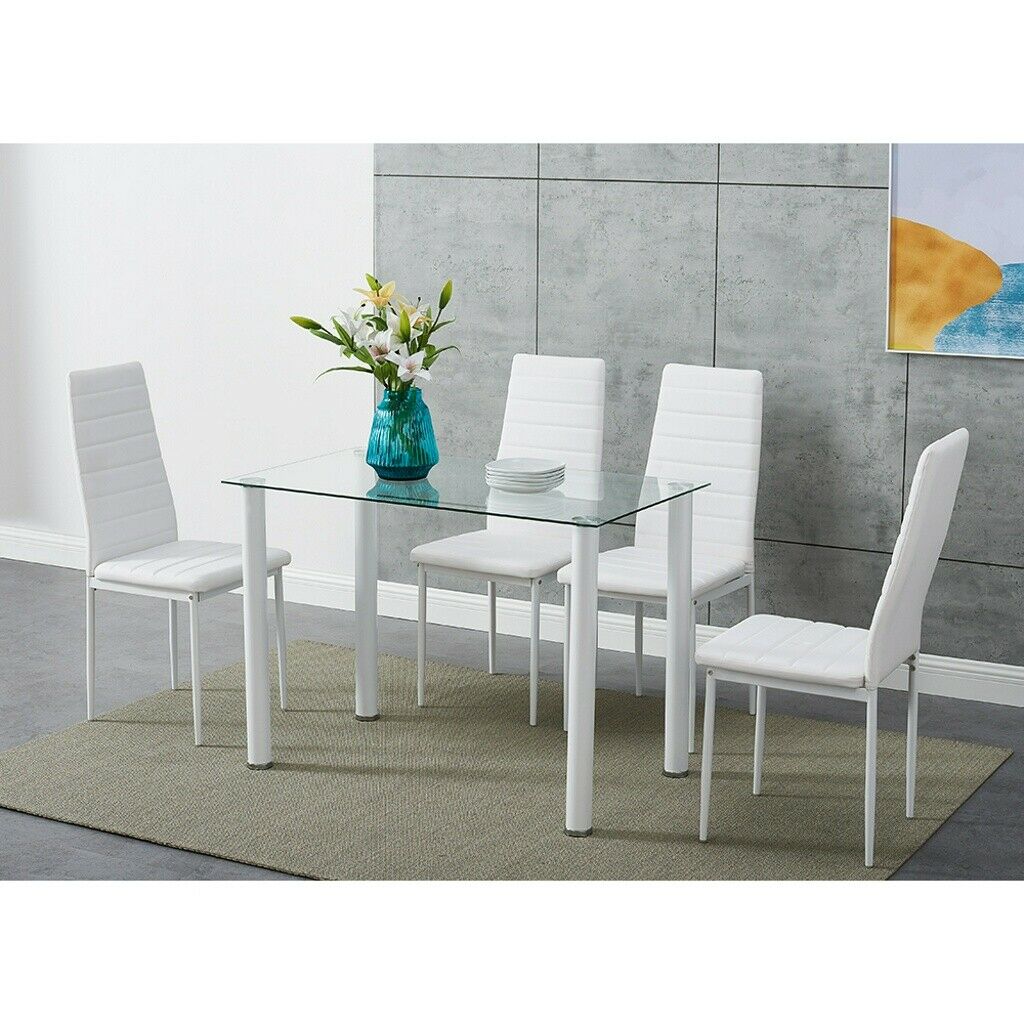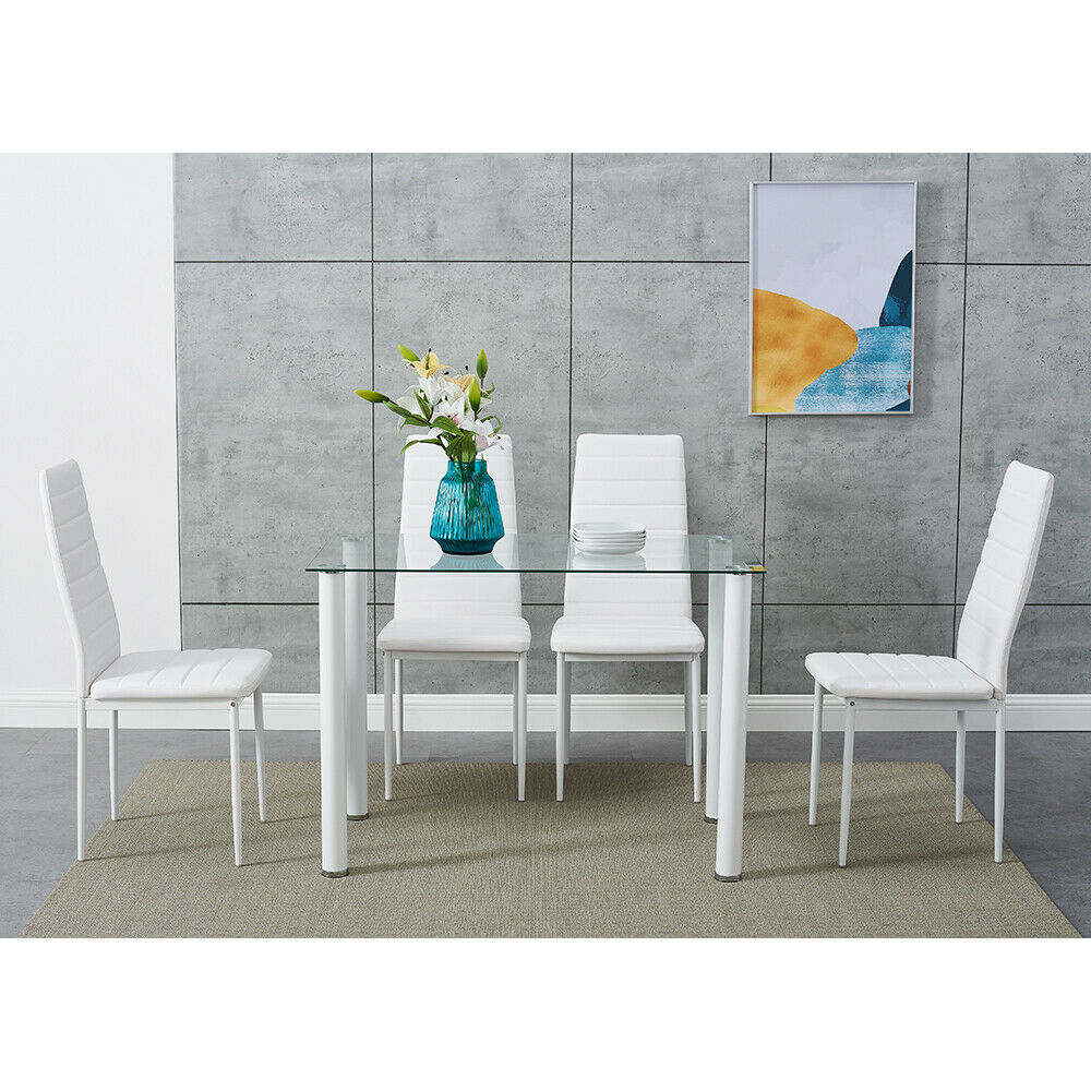 Modern Clear Glass Dining Table and 4 Padded Chairs Set in White Home Furniture