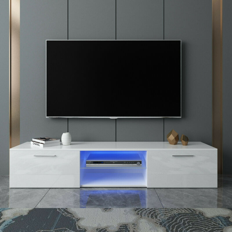Modern LED Light TV Unit Cabinet Stand 160cm Media 2 Doors + Shelf White