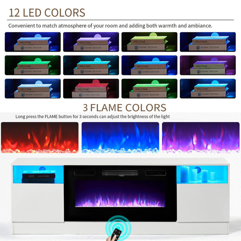 Modern TV Stand 70inch Unit Cabinet w/ Electric Fireplace & 12 Colour LED Light