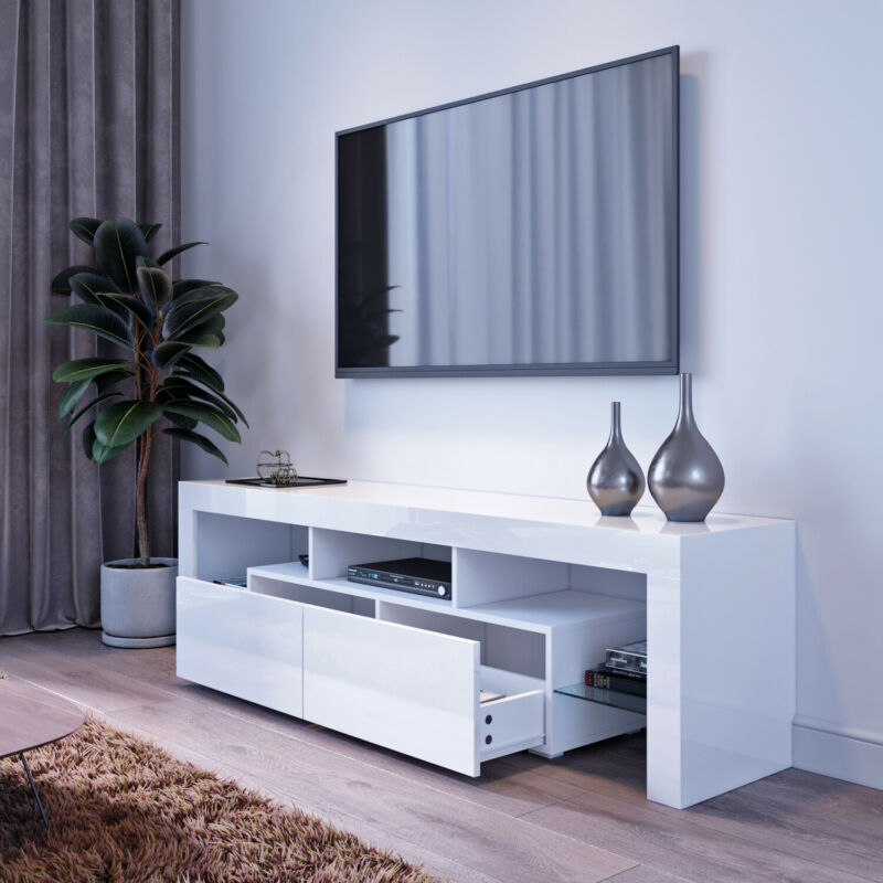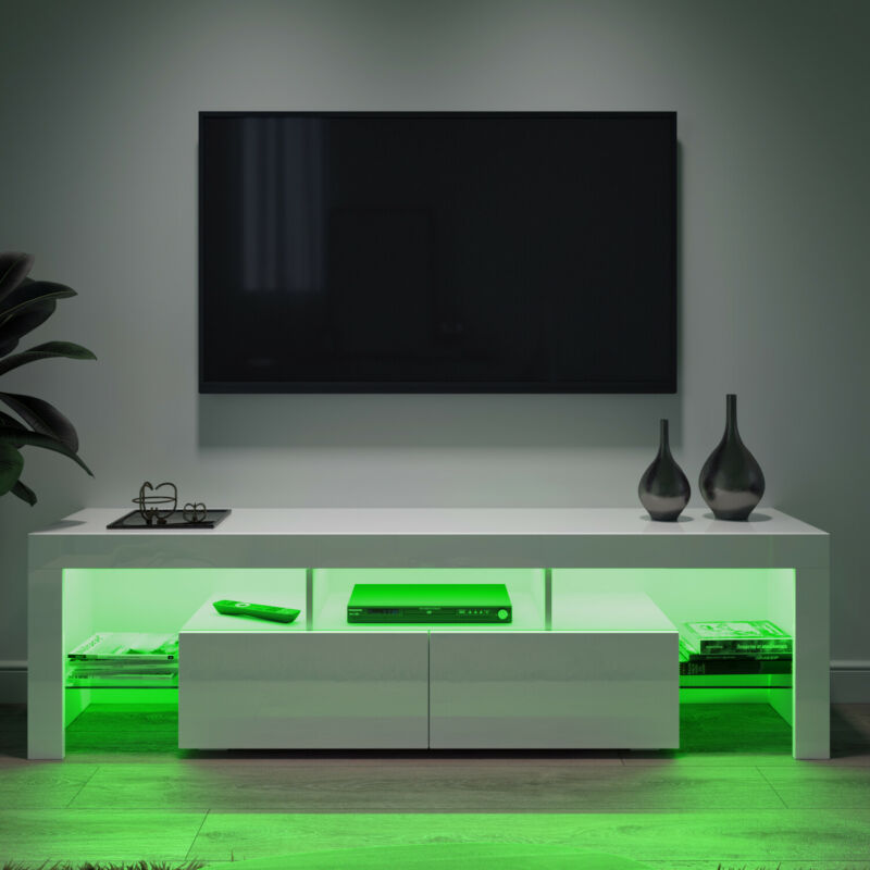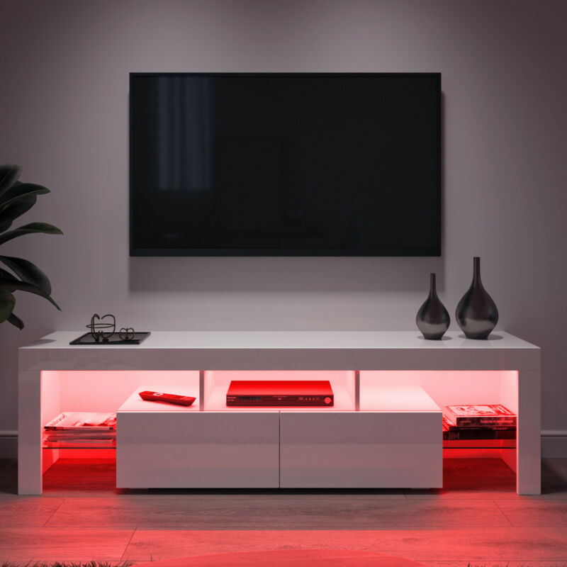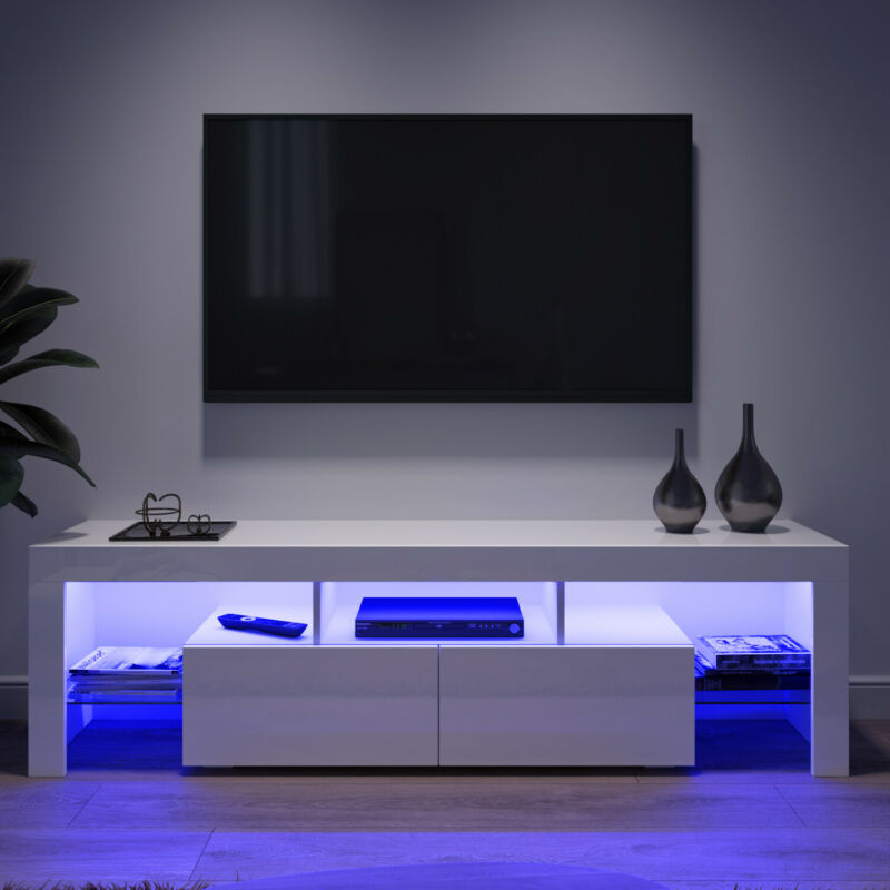 Modern TV Stand White High Gloss Cabinet Entertainment LED Lights Living Room