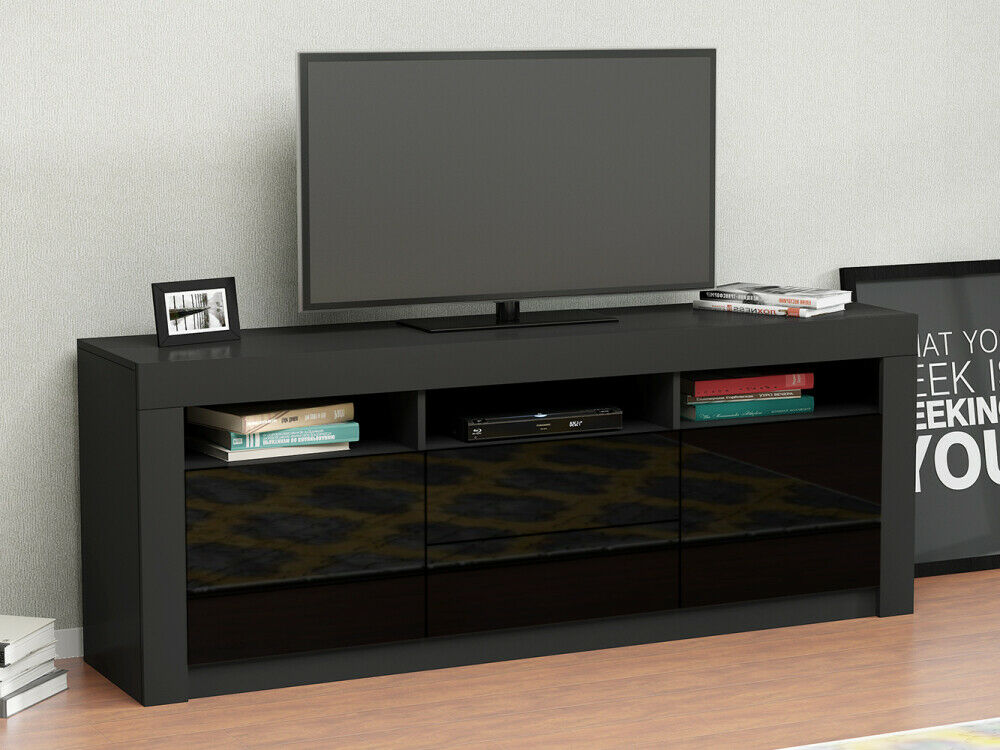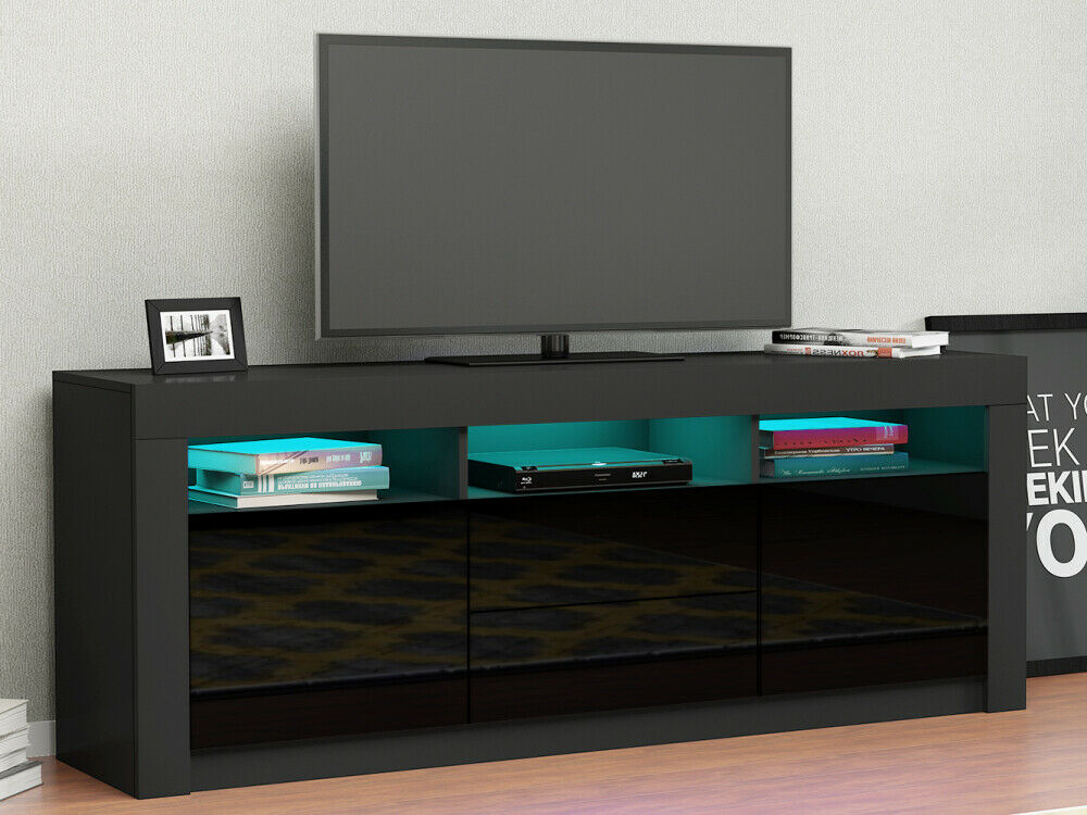 Modern TV Unit Cabinet Stand - Black Matt Body & High Gloss Doors RGB LED Light