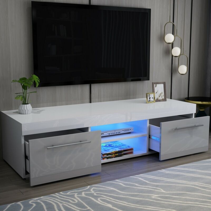 Modern TV Unit Stand Cabinet High Gloss Grey 2 Drawers Glass Shelf & LED Light