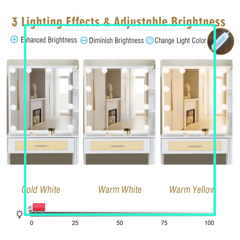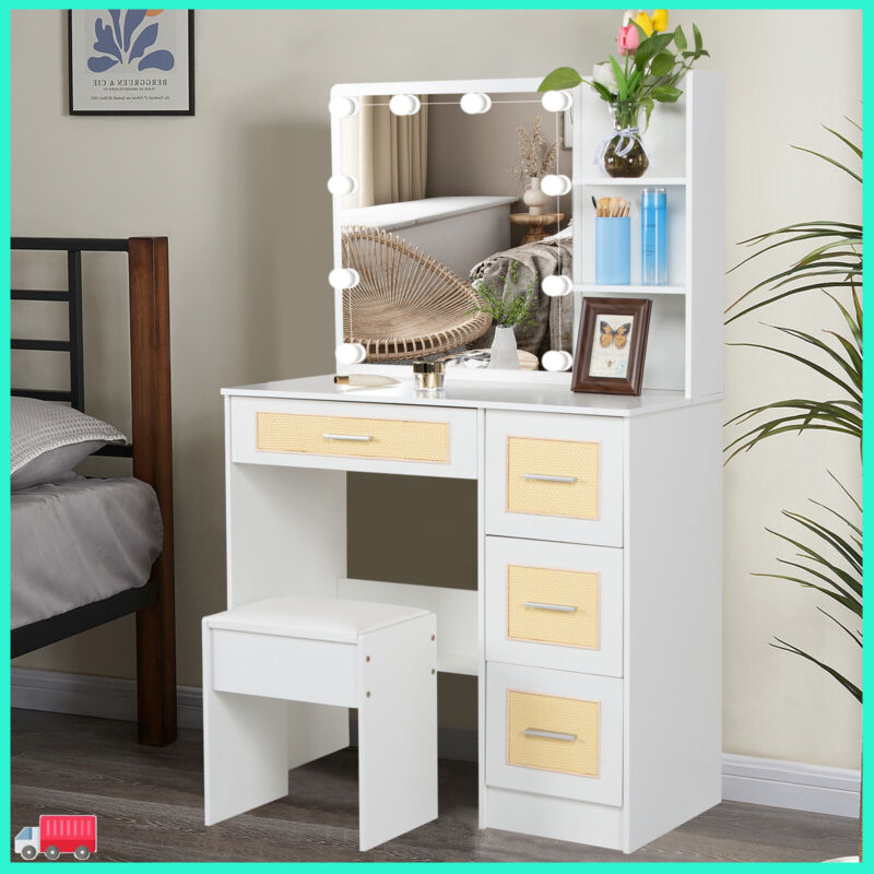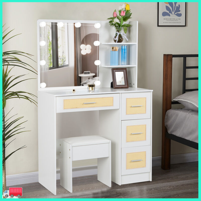Modern Vanity Makeup Dressing Table w/Drawers LED Hollywood Mirror Stool Shelves