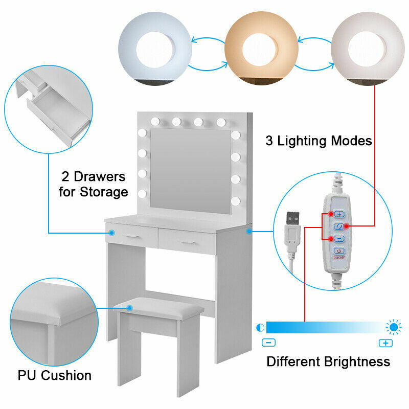Modern White Dressing Table Makeup Desk With LED Mirror Stool 2 Drawers Bedroom